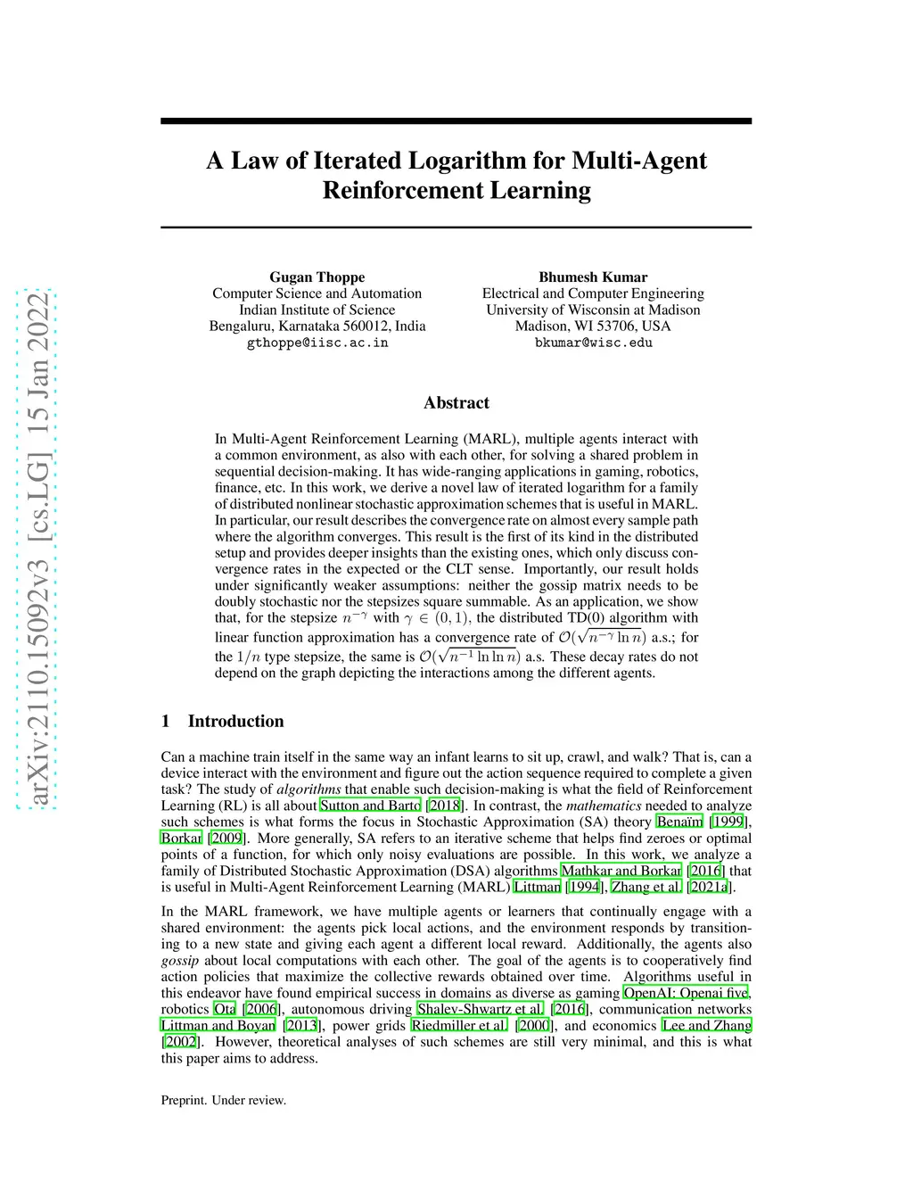 In Multi-Agent Reinforcement Learning (MARL), multiple agents interact with a common environment, as also with each other, for solving a shared problem in sequential decision-making. It has wide-ranging applications in gaming, robotics, finance, etc. In this work, we derive a novel law of iterated logarithm for a family of distributed nonlinear stochastic approximation schemes that is useful in MARL. In particular, our result describes the convergence rate on almost every sample path where the algorithm converges. This result is the first of its kind in the distributed setup and provides deeper insights than the existing ones, which only discuss convergence rates in the expected or the CLT sense. Importantly, our result holds under significantly weaker assumptions: neither the gossip matrix needs to be doubly stochastic nor the stepsizes square summable. As an application, we show that, for the stepsize nγn^{-\gamma} with γ(0,1),\gamma \in (0, 1), the distributed TD(0) algorithm with linear function approximation has a convergence rate of O(nγlnn)O(\sqrt{n^{-\gamma} \ln n }) a.s.; for the 1/n1/n type stepsize, the same is O(n1lnlnn)O(\sqrt{n^{-1} \ln \ln n}) a.s. These decay rates do not depend on the graph depicting the interactions among the different agents.