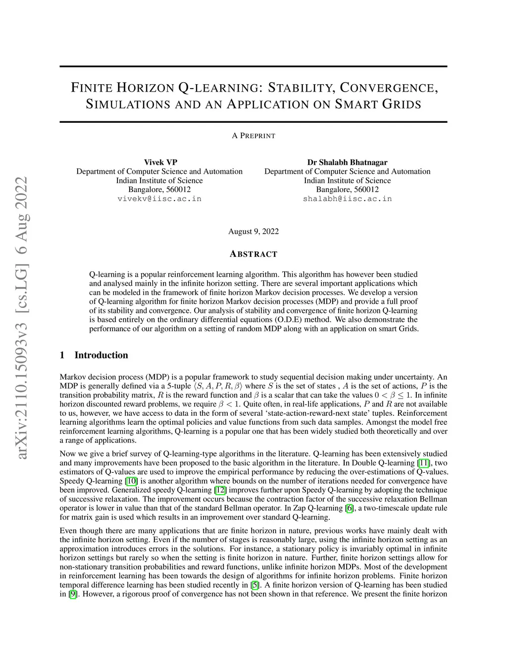 Q-learning is a popular reinforcement learning algorithm. This algorithm has however been studied and analysed mainly in the infinite horizon setting. There are several important applications which can be modeled in the framework of finite horizon Markov decision processes. We develop a version of Q-learning algorithm for finite horizon Markov decision processes (MDP) and provide a full proof of its stability and convergence. Our analysis of stability and convergence of finite horizon Q-learning is based entirely on the ordinary differential equations (O.D.E) method. We also demonstrate the performance of our algorithm on a setting of random MDP as well as on an application on smart grids.