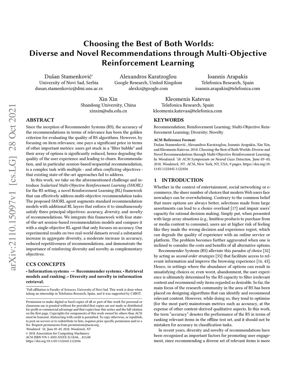 Since the inception of Recommender Systems (RS), the accuracy of the recommendations in terms of relevance has been the golden criterion for evaluating the quality of RS algorithms. However, by focusing on item relevance, one pays a significant price in terms of other important metrics: users get stuck in a "filter bubble" and their array of options is significantly reduced, hence degrading the quality of the user experience and leading to churn. Recommendation, and in particular session-based/sequential recommendation, is a complex task with multiple - and often conflicting objectives - that existing state-of-the-art approaches fail to address. In this work, we take on the aforementioned challenge and introduce Scalarized Multi-Objective Reinforcement Learning (SMORL) for the RS setting, a novel Reinforcement Learning (RL) framework that can effectively address multi-objective recommendation tasks. The proposed SMORL agent augments standard recommendation models with additional RL layers that enforce it to simultaneously satisfy three principal objectives: accuracy, diversity, and novelty of recommendations. We integrate this framework with four state-of-the-art session-based recommendation models and compare it with a single-objective RL agent that only focuses on accuracy. Our experimental results on two real-world datasets reveal a substantial increase in aggregate diversity, a moderate increase in accuracy, reduced repetitiveness of recommendations, and demonstrate the importance of reinforcing diversity and novelty as complementary objectives.