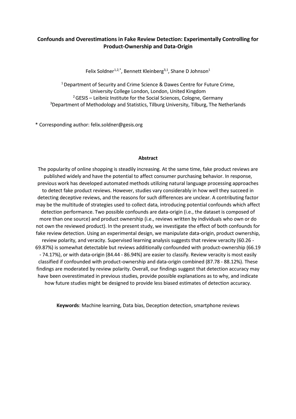 The popularity of online shopping is steadily increasing. At the same time, fake product reviewsare published widely and have the potential to affect consumer purchasing behavior. In response,previous work has developed automated methods for the detection of deceptive product reviews.However, studies vary considerably in terms of classification performance, and many use data thatcontain potential confounds, which makes it difficult to determine their validity. Two possibleconfounds are data-origin (i.e., the dataset is composed of more than one source) and productownership (i.e., reviews written by individuals who own or do not own the reviewed product). Inthe present study, we investigate the effect of both confounds for fake review detection. Using anexperimental design, we manipulate data-origin, product ownership, review polarity, and veracity.Supervised learning analysis suggests that review veracity (60.26 - 69.87%) is somewhat detectablebut reviews additionally confounded with product-ownership (66.19 - 74.17%), or with data-origin(84.44 - 86.94%) are easier to classify. Review veracity is most easily classified if confounded withproduct-ownership and data-origin combined (87.78 - 88.12%), suggesting overestimations of thetrue performance in other work. These findings are moderated by review polarity.