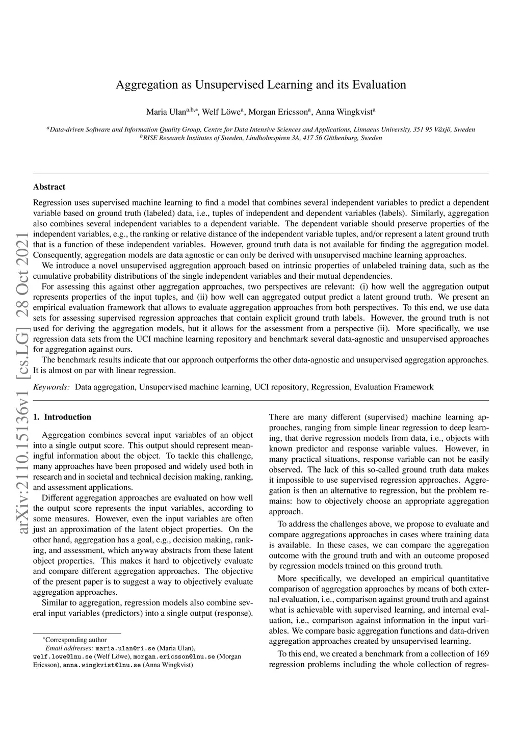 Regression uses supervised machine learning to find a model that combines several independent variables to predict a dependent variable based on ground truth (labeled) data, i.e., tuples of independent and dependent variables (labels). Similarly, aggregation also combines several independent variables to a dependent variable. The dependent variable should preserve properties of the independent variables, e.g., the ranking or relative distance of the independent variable tuples, and/or represent a latent ground truth that is a function of these independent variables. However, ground truth data is not available for finding the aggregation model. Consequently, aggregation models are data agnostic or can only be derived with unsupervised machine learning approaches. We introduce a novel unsupervised aggregation approach based on intrinsic properties of unlabeled training data, such as the cumulative probability distributions of the single independent variables and their mutual dependencies. We present an empirical evaluation framework that allows assessing the proposed approach against other aggregation approaches from two perspectives: (i) how well the aggregation output represents properties of the input tuples, and (ii) how well can aggregated output predict a latent ground truth. To this end, we use data sets for assessing supervised regression approaches that contain explicit ground truth labels. However, the ground truth is not used for deriving the aggregation models, but it allows for the assessment from a perspective (ii). More specifically, we use regression data sets from the UCI machine learning repository and benchmark several data-agnostic and unsupervised approaches for aggregation against ours. The benchmark results indicate that our approach outperforms the other data-agnostic and unsupervised aggregation approaches. It is almost on par with linear regression.
