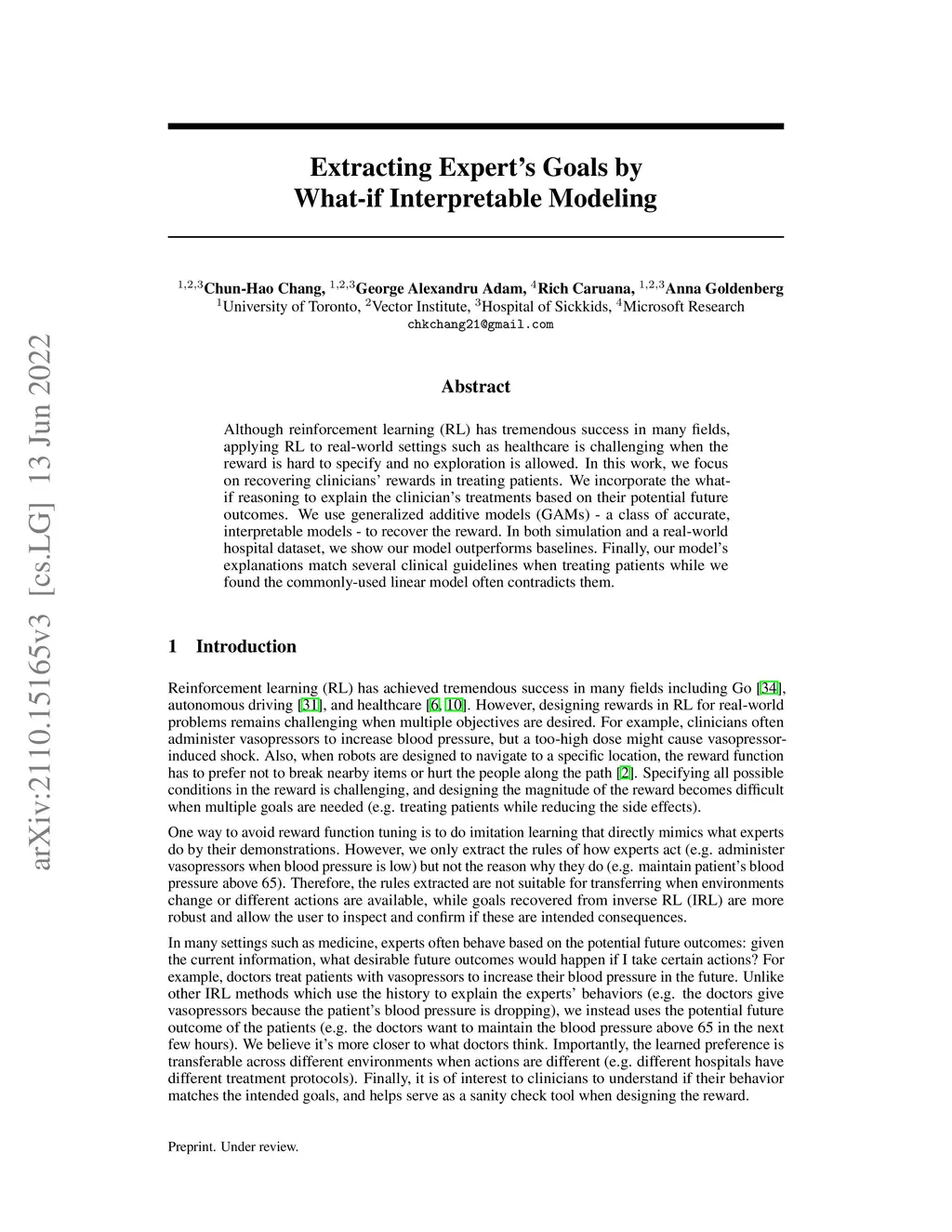 Although reinforcement learning (RL) has tremendous success in many fields, applying RL to real-world settings such as healthcare is challenging when the reward is hard to specify and no exploration is allowed. In this work, we focus on recovering clinicians' rewards in treating patients. We incorporate the what-if reasoning to explain the clinician's treatments based on their potential future outcomes. We use generalized additive models (GAMs) - a class of accurate, interpretable models - to recover the reward. In both simulation and a real-world hospital dataset, we show our model outperforms baselines. Finally, our model's explanations match several clinical guidelines when treating patients while we found the commonly-used linear model often contradicts them.