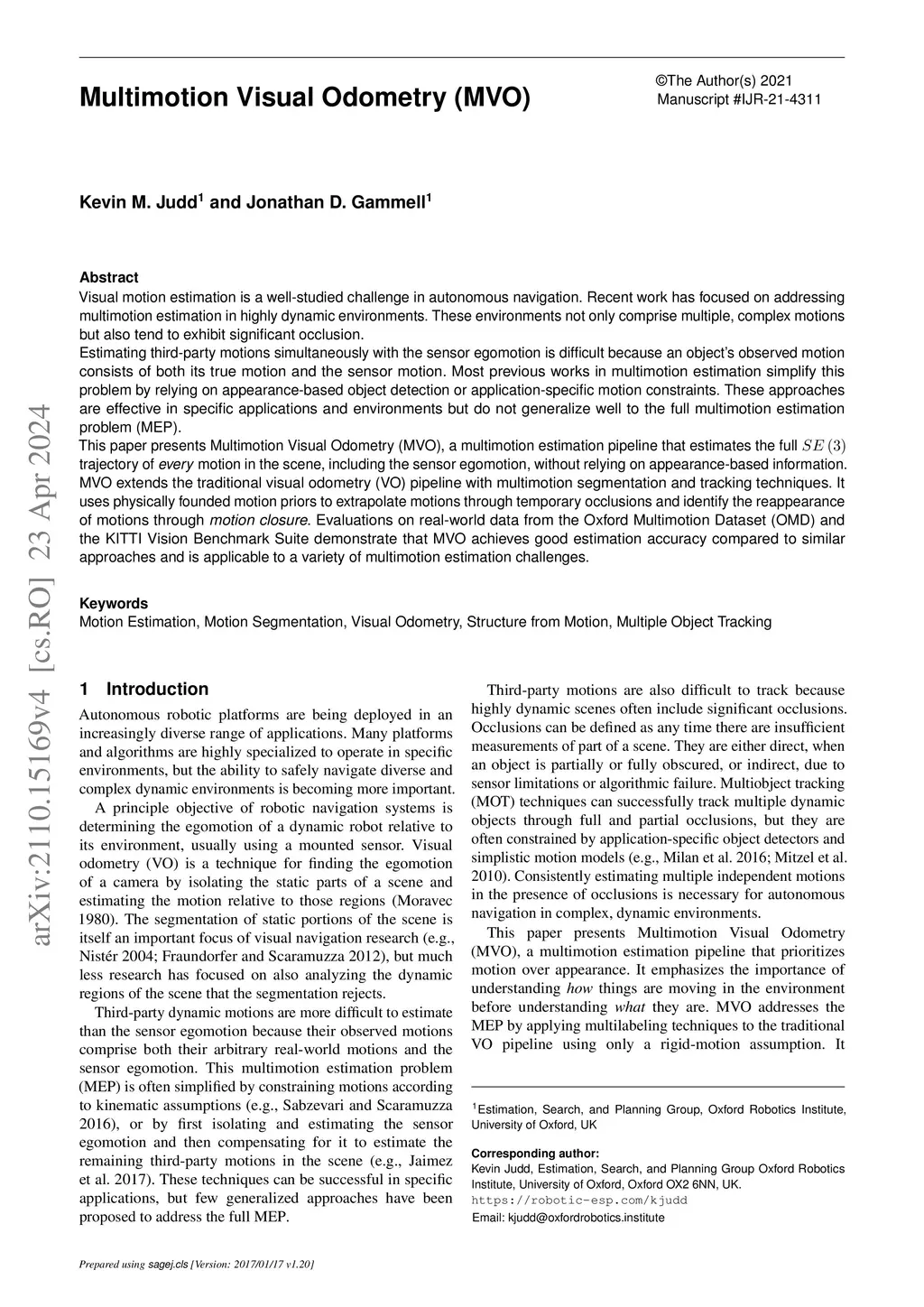 Visual motion estimation is a well-studied challenge in autonomous navigation. Recent work has focused on addressing multimotion estimation in highly dynamic environments. These environments not only comprise multiple, complex motions but also tend to exhibit significant occlusion. Estimating third-party motions simultaneously with the sensor egomotion is difficult because an object's observed motion consists of both its true motion and the sensor motion. Most previous works in multimotion estimation simplify this problem by relying on appearance-based object detection or application-specific motion constraints. These approaches are effective in specific applications and environments but do not generalize well to the full multimotion estimation problem (MEP). This paper presents Multimotion Visual Odometry (MVO), a multimotion estimation pipeline that estimates the full SE(3) trajectory of every motion in the scene, including the sensor egomotion, without relying on appearance-based information. MVO extends the traditional visual odometry (VO) pipeline with multimotion segmentation and tracking techniques. It uses physically founded motion priors to extrapolate motions through temporary occlusions and identify the reappearance of motions through motion closure. Evaluations on real-world data from the Oxford Multimotion Dataset (OMD) and the KITTI Vision Benchmark Suite demonstrate that MVO achieves good estimation accuracy compared to similar approaches and is applicable to a variety of multimotion estimation challenges.