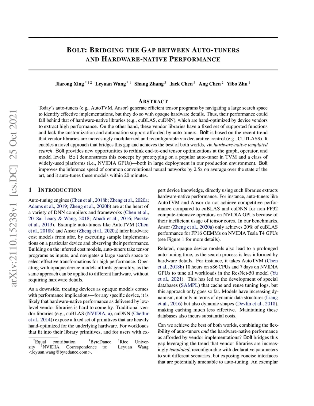 Today's auto-tuners (e.g., AutoTVM, Ansor) generate efficient tensor programs by navigating a large search space to identify effective implementations, but they do so with opaque hardware details. Thus, their performance could fall behind that of hardware-native libraries (e.g., cuBLAS, cuDNN), which are hand-optimized by device vendors to extract high performance. On the other hand, these vendor libraries have a fixed set of supported functions and lack the customization and automation support afforded by auto-tuners. Bolt is based on the recent trend that vendor libraries are increasingly modularized and reconfigurable via declarative control (e.g., CUTLASS). It enables a novel approach that bridges this gap and achieves the best of both worlds, via hardware-native templated search. Bolt provides new opportunities to rethink end-to-end tensor optimizations at the graph, operator, and model levels. Bolt demonstrates this concept by prototyping on a popular auto-tuner in TVM and a class of widely-used platforms (i.e., NVIDIA GPUs) -- both in large deployment in our production environment. Bolt improves the inference speed of common convolutional neural networks by 2.5x on average over the state of the art, and it auto-tunes these models within 20 minutes.