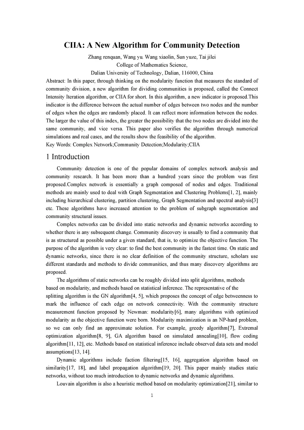 In this paper, through thinking on the modularity function that measures the standard of community division, a new algorithm for dividing communities is proposed, called the Connect Intensity Iteration algorithm, or CIIA for short. In this algorithm, a new indicator is proposed.This indicator is the difference between the actual number of edges between two nodes and the number of edges when the edges are randomly placed. It can reflect more information between the nodes. The larger the value of this index, the greater the possibility that the two nodes are divided into the same community, and vice versa. This paper also verifies the algorithm through numerical simulations and real cases, and the results show the feasibility of the algorithm.