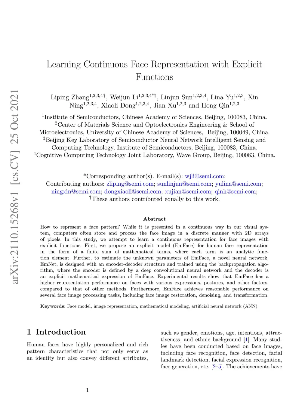 How to represent a face pattern? While it is presented in a continuous way in our visual system, computers often store and process the face image in a discrete manner with 2D arrays of pixels. In this study, we attempt to learn a continuous representation for face images with explicit functions. First, we propose an explicit model (EmFace) for human face representation in the form of a finite sum of mathematical terms, where each term is an analytic function element. Further, to estimate the unknown parameters of EmFace, a novel neural network, EmNet, is designed with an encoder-decoder structure and trained using the backpropagation algorithm, where the encoder is defined by a deep convolutional neural network and the decoder is an explicit mathematical expression of EmFace. Experimental results show that EmFace has a higher representation performance on faces with various expressions, postures, and other factors, compared to that of other methods. Furthermore, EmFace achieves reasonable performance on several face image processing tasks, including face image restoration, denoising, and transformation.