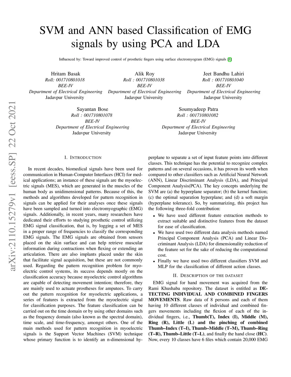 SVM and ANN based Classification of EMG signals by using PCA and LDA
