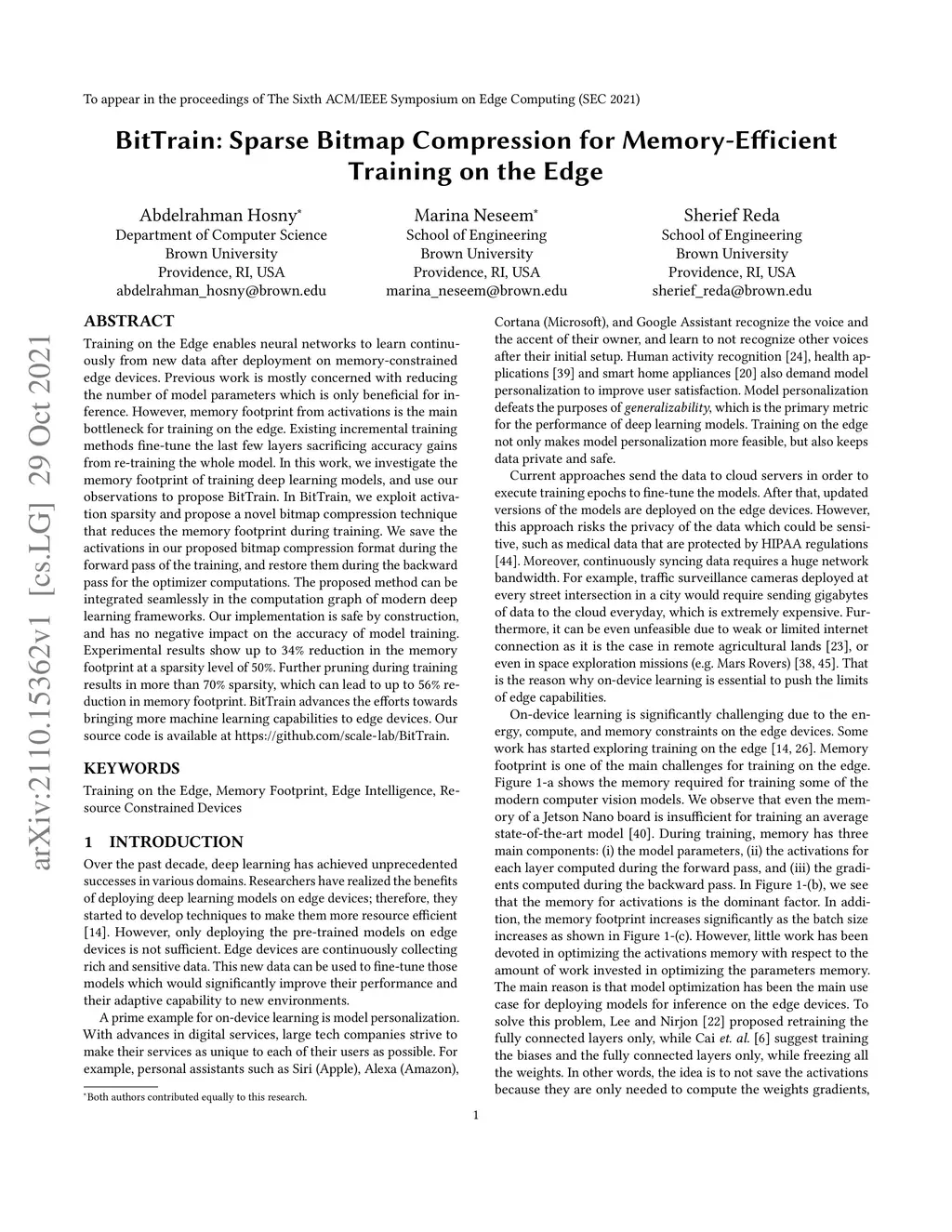Training on the Edge enables neural networks to learn continuously from new data after deployment on memory-constrained edge devices. Previous work is mostly concerned with reducing the number of model parameters which is only beneficial for inference. However, memory footprint from activations is the main bottleneck for training on the edge. Existing incremental training methods fine-tune the last few layers sacrificing accuracy gains from re-training the whole model. In this work, we investigate the memory footprint of training deep learning models, and use our observations to propose BitTrain. In BitTrain, we exploit activation sparsity and propose a novel bitmap compression technique that reduces the memory footprint during training. We save the activations in our proposed bitmap compression format during the forward pass of the training, and restore them during the backward pass for the optimizer computations. The proposed method can be integrated seamlessly in the computation graph of modern deep learning frameworks. Our implementation is safe by construction, and has no negative impact on the accuracy of model training. Experimental results show up to 34% reduction in the memory footprint at a sparsity level of 50%. Further pruning during training results in more than 70% sparsity, which can lead to up to 56% reduction in memory footprint. BitTrain advances the efforts towards bringing more machine learning capabilities to edge devices. Our source code is available at https://github.com/scale-lab/BitTrain.
