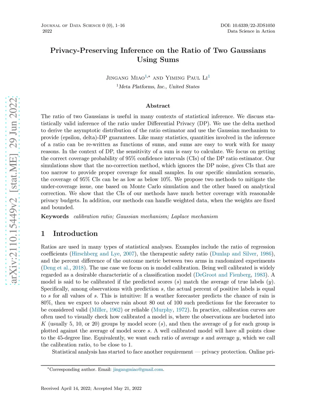 Privacy-Preserving Inference on the Ratio of Two Gaussians Using Sums