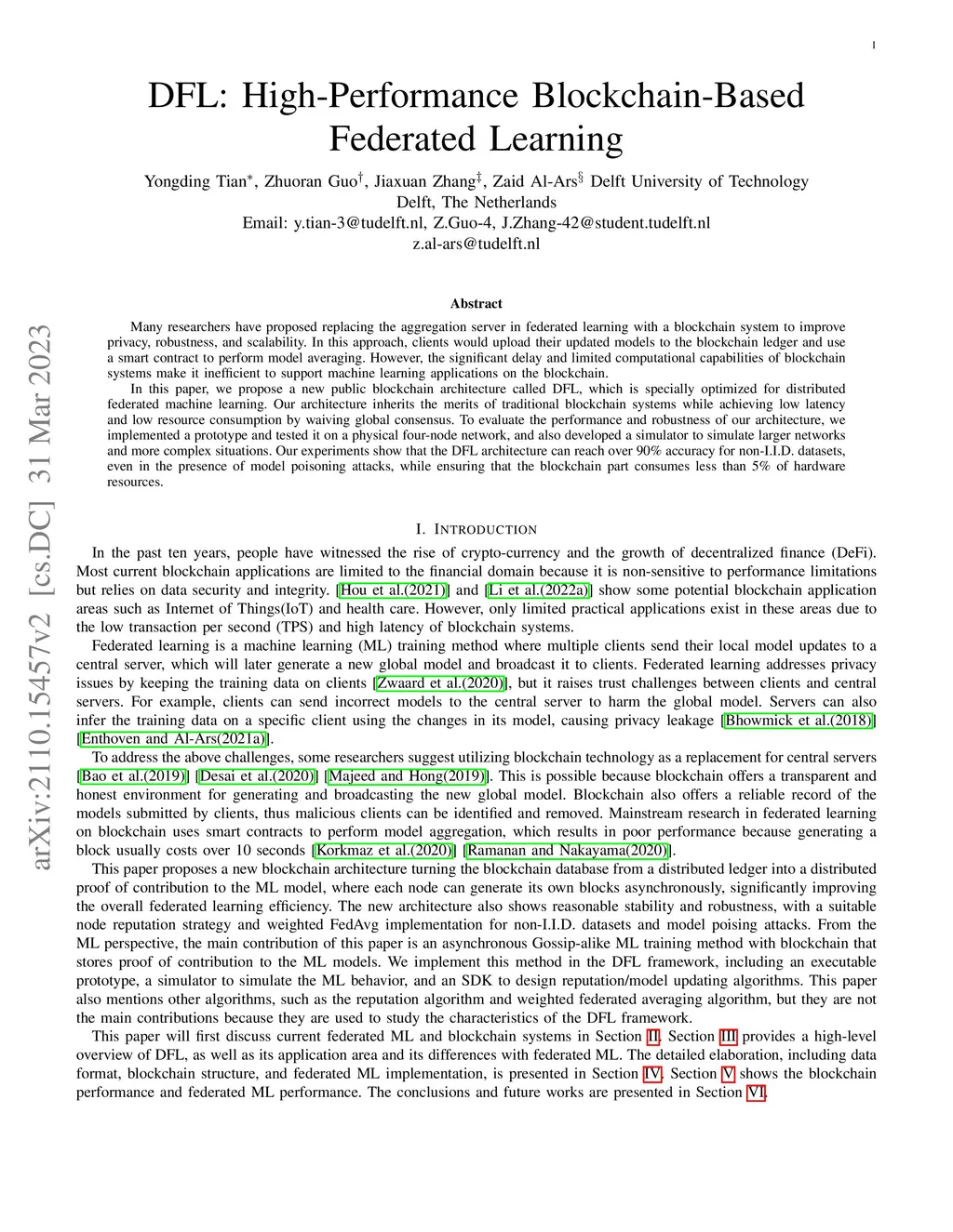 Many researchers have proposed replacing the aggregation server in federated learning with a blockchain system to improve privacy, robustness, and scalability. In this approach, clients would upload their updated models to the blockchain ledger and use a smart contract to perform model averaging. However, the significant delay and limited computational capabilities of blockchain systems make it inefficient to support machine learning applications on the blockchain. In this paper, we propose a new public blockchain architecture called DFL, which is specially optimized for distributed federated machine learning. Our architecture inherits the merits of traditional blockchain systems while achieving low latency and low resource consumption by waiving global consensus. To evaluate the performance and robustness of our architecture, we implemented a prototype and tested it on a physical four-node network, and also developed a simulator to simulate larger networks and more complex situations. Our experiments show that the DFL architecture can reach over 90\% accuracy for non-I.I.D. datasets, even in the presence of model poisoning attacks, while ensuring that the blockchain part consumes less than 5\% of hardware resources.