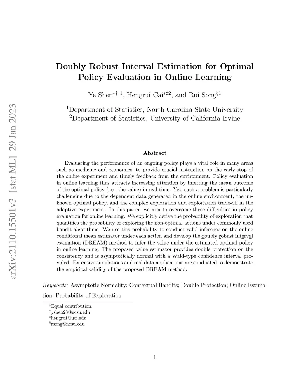 Evaluating the performance of an ongoing policy plays a vital role in many areas such as medicine and economics, to provide crucial instruction on the early-stop of the online experiment and timely feedback from the environment. Policy evaluation in online learning thus attracts increasing attention by inferring the mean outcome of the optimal policy (i.e., the value) in real-time. Yet, such a problem is particularly challenging due to the dependent data generated in the online environment, the unknown optimal policy, and the complex exploration and exploitation trade-off in the adaptive experiment. In this paper, we aim to overcome these difficulties in policy evaluation for online learning. We explicitly derive the probability of exploration that quantifies the probability of exploring the non-optimal actions under commonly used bandit algorithms. We use this probability to conduct valid inference on the online conditional mean estimator under each action and develop the doubly robust interval estimation (DREAM) method to infer the value under the estimated optimal policy in online learning. The proposed value estimator provides double protection on the consistency and is asymptotically normal with a Wald-type confidence interval provided. Extensive simulations and real data applications are conducted to demonstrate the empirical validity of the proposed DREAM method.