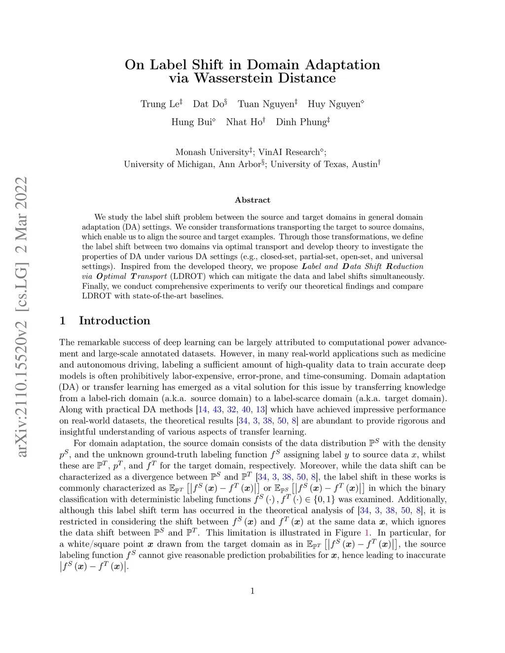 We study the label shift problem between the source and target domains in general domain adaptation (DA) settings. We consider transformations transporting the target to source domains, which enable us to align the source and target examples. Through those transformations, we define the label shift between two domains via optimal transport and develop theory to investigate the properties of DA under various DA settings (e.g., closed-set, partial-set, open-set, and universal settings). Inspired from the developed theory, we propose Label and Data Shift Reduction via Optimal Transport (LDROT) which can mitigate the data and label shifts simultaneously. Finally, we conduct comprehensive experiments to verify our theoretical findings and compare LDROT with state-of-the-art baselines.
