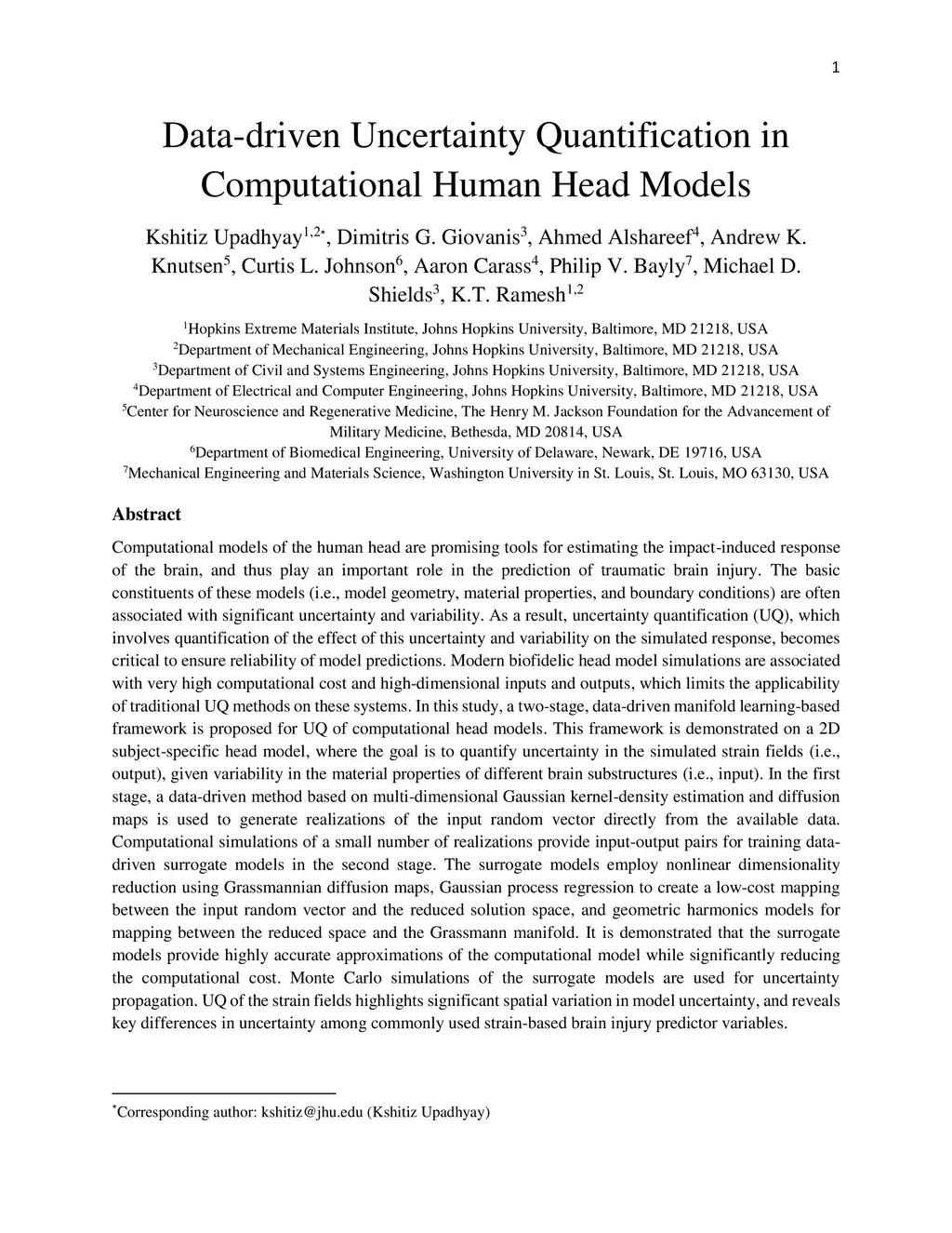 Computational models of the human head are promising tools for estimating the impact-induced response of brain, and thus play an important role in the prediction of traumatic brain injury. Modern biofidelic head model simulations are associated with very high computational cost, and high-dimensional inputs and outputs, which limits the applicability of traditional uncertainty quantification (UQ) methods on these systems. In this study, a two-stage, data-driven manifold learning-based framework is proposed for UQ of computational head models. This framework is demonstrated on a 2D subject-specific head model, where the goal is to quantify uncertainty in the simulated strain fields (i.e., output), given variability in the material properties of different brain substructures (i.e., input). In the first stage, a data-driven method based on multi-dimensional Gaussian kernel-density estimation and diffusion maps is used to generate realizations of the input random vector directly from the available data. Computational simulations of a small number of realizations provide input-output pairs for training data-driven surrogate models in the second stage. The surrogate models employ nonlinear dimensionality reduction using Grassmannian diffusion maps, Gaussian process regression to create a low-cost mapping between the input random vector and the reduced solution space, and geometric harmonics models for mapping between the reduced space and the Grassmann manifold. It is demonstrated that the surrogate models provide highly accurate approximations of the computational model while significantly reducing the computational cost. Monte Carlo simulations of the surrogate models are used for uncertainty propagation. UQ of strain fields highlight significant spatial variation in model uncertainty, and reveal key differences in uncertainty among commonly used strain-based brain injury predictor variables.