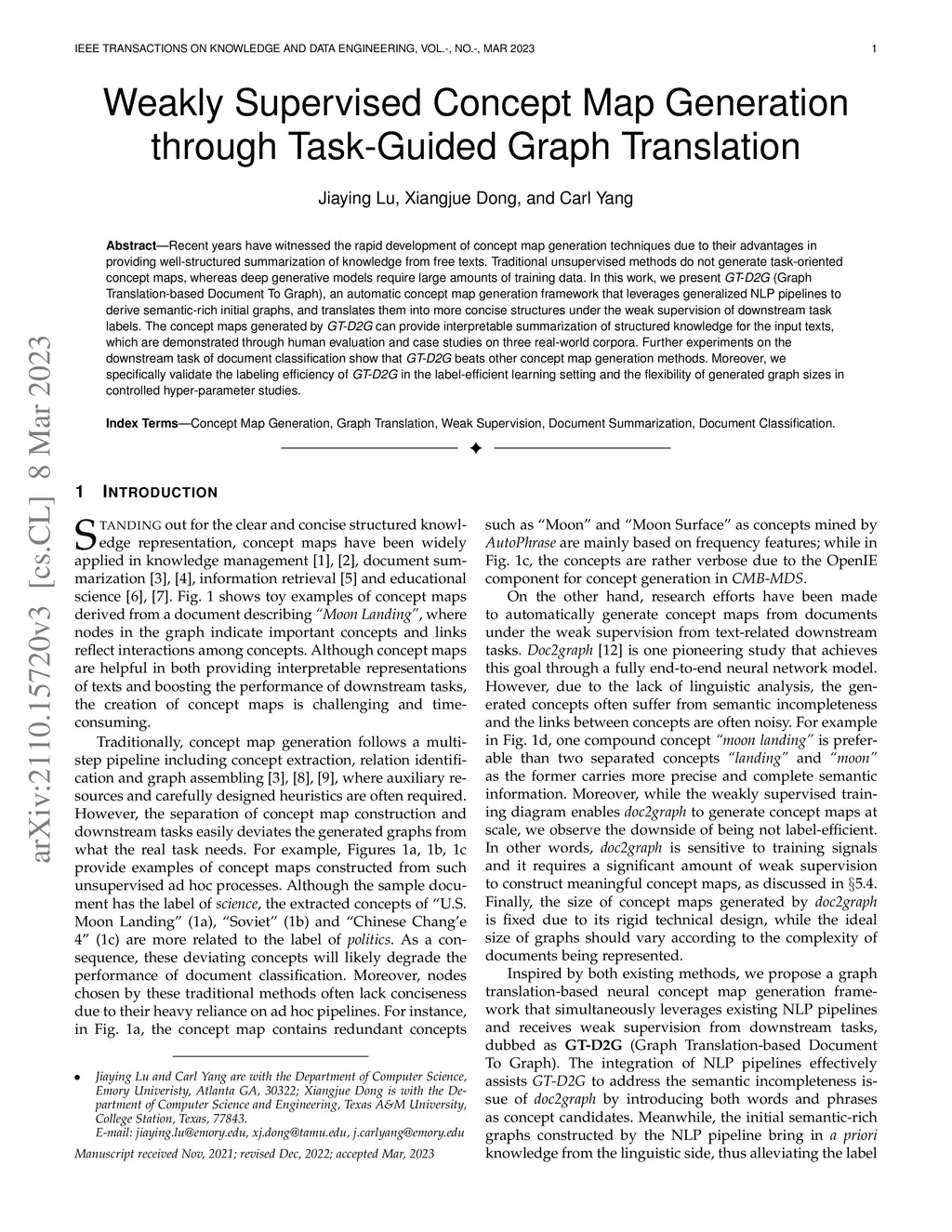 Recent years have witnessed the rapid development of concept map generation techniques due to their advantages in providing well-structured summarization of knowledge from free texts. Traditional unsupervised methods do not generate task-oriented concept maps, whereas deep generative models require large amounts of training data. In this work, we present GT-D2G (Graph Translation-based Document To Graph), an automatic concept map generation framework that leverages generalized NLP pipelines to derive semantic-rich initial graphs, and translates them into more concise structures under the weak supervision of downstream task labels. The concept maps generated by GT-D2G can provide interpretable summarization of structured knowledge for the input texts, which are demonstrated through human evaluation and case studies on three real-world corpora. Further experiments on the downstream task of document classification show that GT-D2G beats other concept map generation methods. Moreover, we specifically validate the labeling efficiency of GT-D2G in the label-efficient learning setting and the flexibility of generated graph sizes in controlled hyper-parameter studies.
