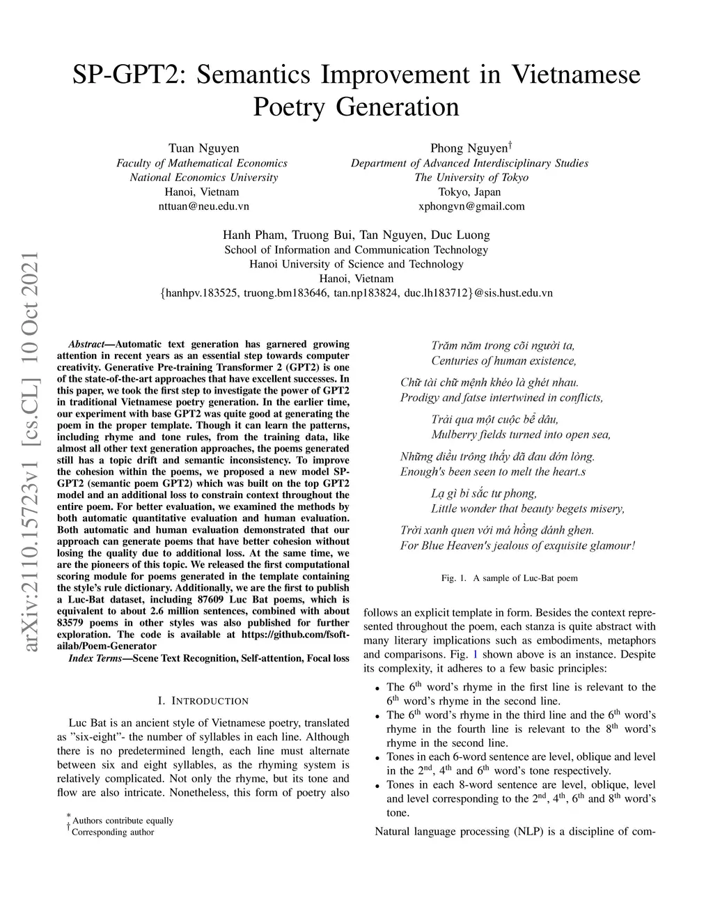 Automatic text generation has garnered growing attention in recent years as an essential step towards computer creativity. Generative Pretraining Transformer 2 (GPT2) is one of the state of the art approaches that have excellent successes. In this paper, we took the first step to investigate the power of GPT2 in traditional Vietnamese poetry generation. In the earlier time, our experiment with base GPT2 was quite good at generating the poem in the proper template. Though it can learn the patterns, including rhyme and tone rules, from the training data, like almost all other text generation approaches, the poems generated still has a topic drift and semantic inconsistency. To improve the cohesion within the poems, we proposed a new model SP-GPT2 (semantic poem GPT2) which was built on the top GPT2 model and an additional loss to constrain context throughout the entire poem. For better evaluation, we examined the methods by both automatic quantitative evaluation and human evaluation. Both automatic and human evaluation demonstrated that our approach can generate poems that have better cohesion without losing the quality due to additional loss. At the same time, we are the pioneers of this topic. We released the first computational scoring module for poems generated in the template containing the style rule dictionary. Additionally, we are the first to publish a Luc-Bat dataset, including 87609 Luc Bat poems, which is equivalent to about 2.6 million sentences, combined with about 83579 poems in other styles was also published for further exploration. The code is available at https://github.com/fsoft-ailab/Poem-Generator