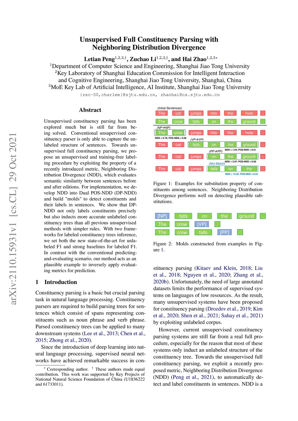 Unsupervised constituency parsing has been explored much but is still far from being solved. Conventional unsupervised constituency parser is only able to capture the unlabeled structure of sentences. Towards unsupervised full constituency parsing, we propose an unsupervised and training-free labeling procedure by exploiting the property of a recently introduced metric, Neighboring Distribution Divergence (NDD), which evaluates semantic similarity between sentences before and after editions. For implementation, we develop NDD into Dual POS-NDD (DP-NDD) and build "molds" to detect constituents and their labels in sentences. We show that DP-NDD not only labels constituents precisely but also inducts more accurate unlabeled constituency trees than all previous unsupervised methods with simpler rules. With two frameworks for labeled constituency trees inference, we set both the new state-of-the-art for unlabeled F1 and strong baselines for labeled F1. In contrast with the conventional predicting-and-evaluating scenario, our method acts as an plausible example to inversely apply evaluating metrics for prediction.