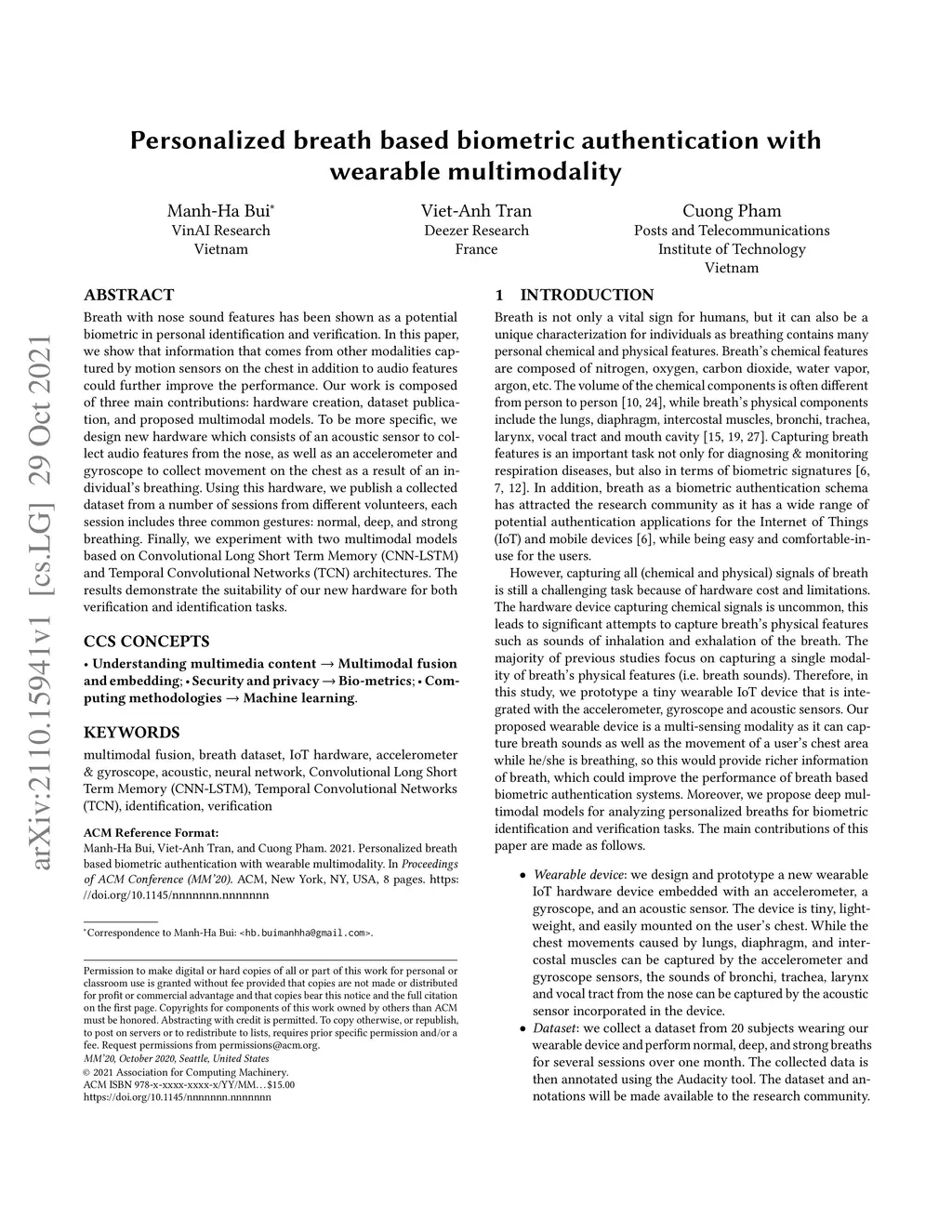 Breath with nose sound features has been shown as a potential biometric in personal identification and verification. In this paper, we show that information that comes from other modalities captured by motion sensors on the chest in addition to audio features could further improve the performance. Our work is composed of three main contributions: hardware creation, dataset publication, and proposed multimodal models. To be more specific, we design new hardware which consists of an acoustic sensor to collect audio features from the nose, as well as an accelerometer and gyroscope to collect movement on the chest as a result of an individual's breathing. Using this hardware, we publish a collected dataset from a number of sessions from different volunteers, each session includes three common gestures: normal, deep, and strong breathing. Finally, we experiment with two multimodal models based on Convolutional Long Short Term Memory (CNN-LSTM) and Temporal Convolutional Networks (TCN) architectures. The results demonstrate the suitability of our new hardware for both verification and identification tasks.