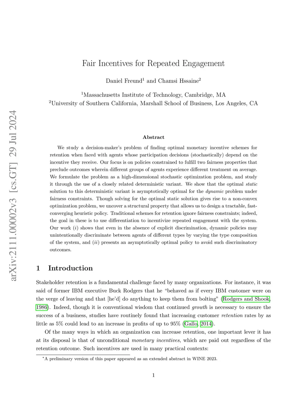 We study a decision-maker's problem of finding optimal monetary incentive schemes when faced with agents whose participation decisions (stochastically) depend on the incentive they receive. Our focus is on policies constrained to fulfill two fairness properties that preclude outcomes wherein different groups of agents experience different treatment on average. We formulate the problem as a high-dimensional stochastic optimization problem, and study it through the use of a closely related deterministic variant. We show that the optimal static solution to this deterministic variant is asymptotically optimal for the dynamic problem under fairness constraints. Though solving for the optimal static solution gives rise to a non-convex optimization problem, we uncover a structural property that allows us to design a tractable, fast-converging heuristic policy. Traditional schemes for stakeholder retention ignore fairness constraints; indeed, the goal in these is to use differentiation to incentivize repeated engagement with the system. Our work (i) shows that even in the absence of explicit discrimination, dynamic policies may unintentionally discriminate between agents of different types by varying the type composition of the system, and (ii) presents an asymptotically optimal policy to avoid such discriminatory outcomes.