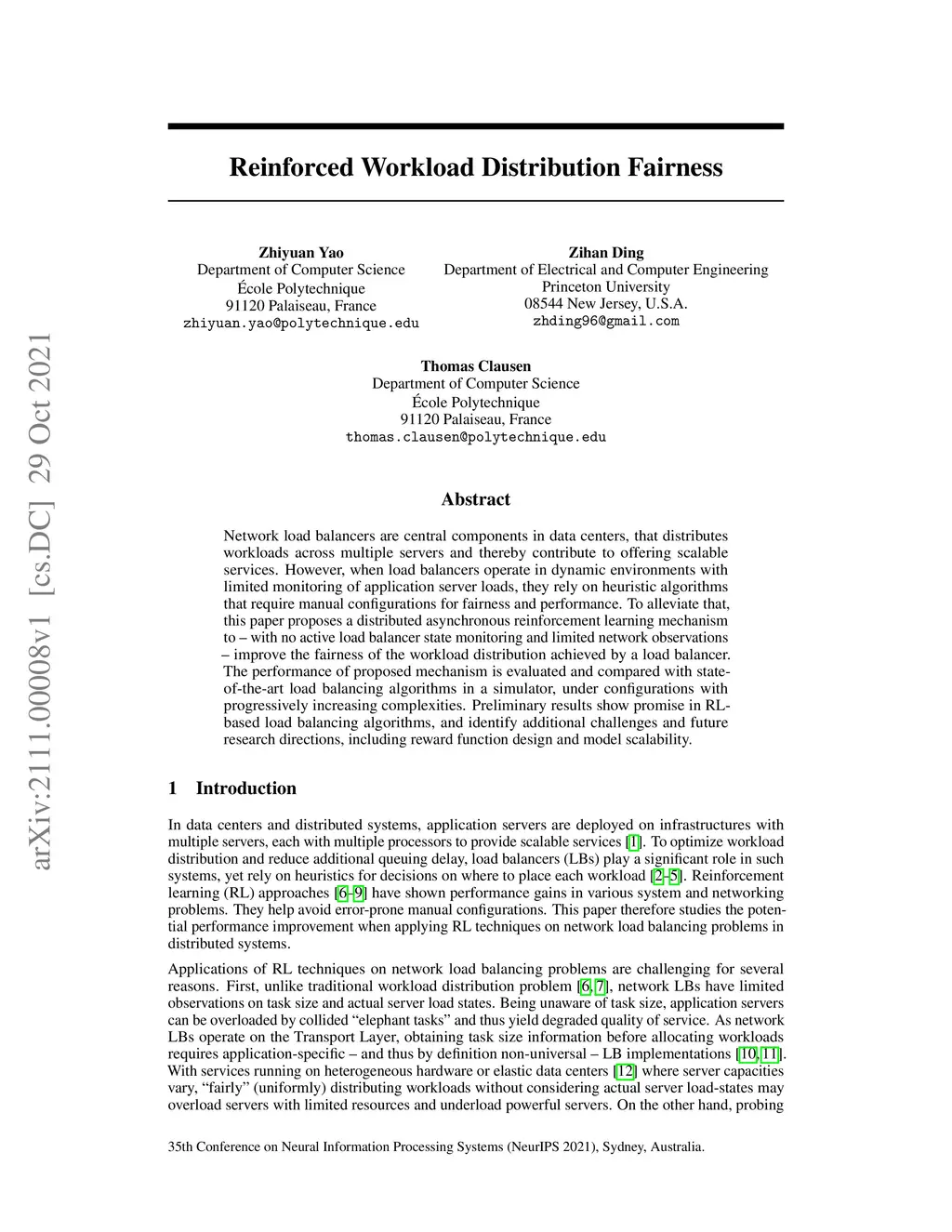 Network load balancers are central components in data centers, that distributes workloads across multiple servers and thereby contribute to offering scalable services. However, when load balancers operate in dynamic environments with limited monitoring of application server loads, they rely on heuristic algorithms that require manual configurations for fairness and performance. To alleviate that, this paper proposes a distributed asynchronous reinforcement learning mechanism to-with no active load balancer state monitoring and limited network observations-improve the fairness of the workload distribution achieved by a load balancer. The performance of proposed mechanism is evaluated and compared with stateof-the-art load balancing algorithms in a simulator, under configurations with progressively increasing complexities. Preliminary results show promise in RLbased load balancing algorithms, and identify additional challenges and future research directions, including reward function design and model scalability.