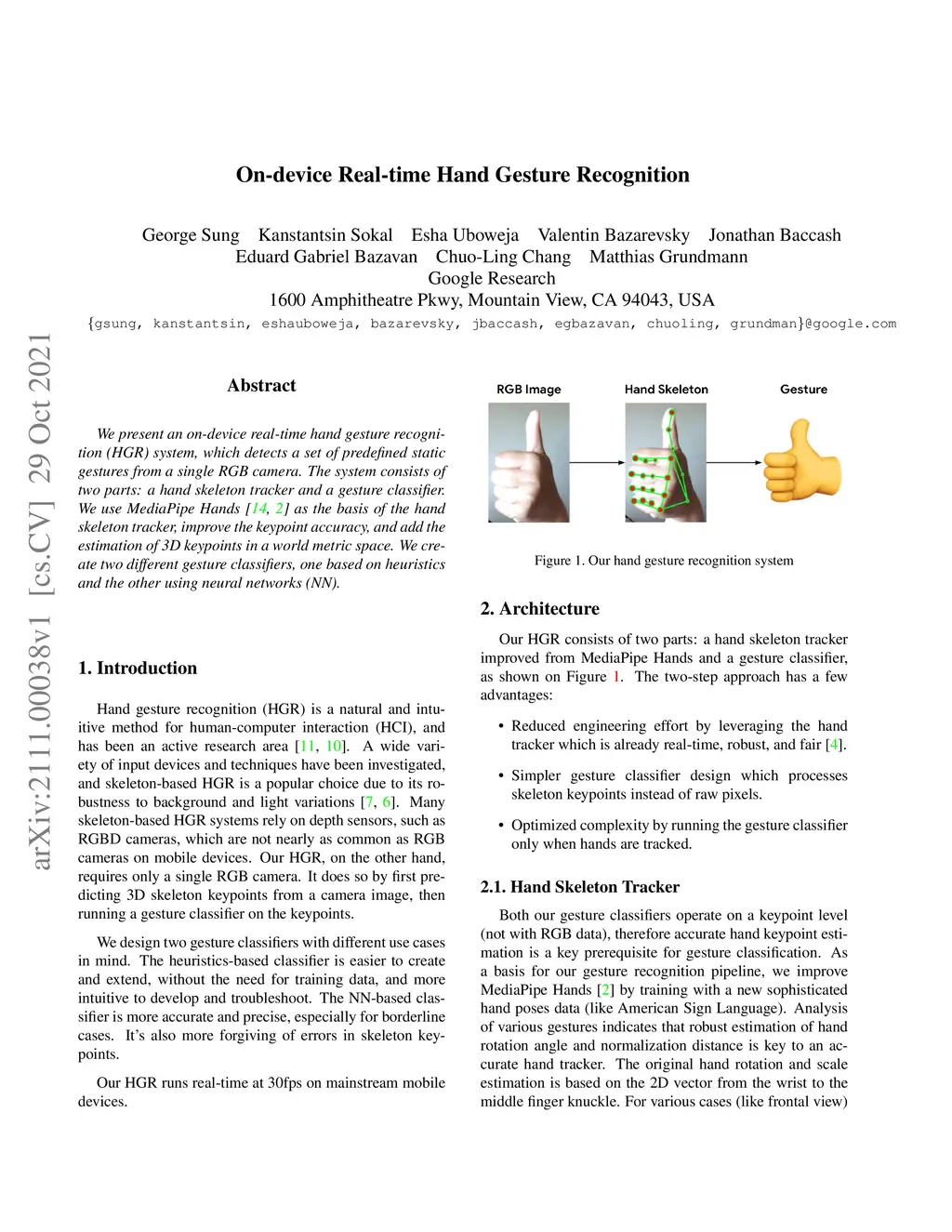 We present an on-device real-time hand gesture recognition (HGR) system, which detects a set of predefined static gestures from a single RGB camera. The system consists of two parts: a hand skeleton tracker and a gesture classifier. We use MediaPipe Hands as the basis of the hand skeleton tracker, improve the keypoint accuracy, and add the estimation of 3D keypoints in a world metric space. We create two different gesture classifiers, one based on heuristics and the other using neural networks (NN).