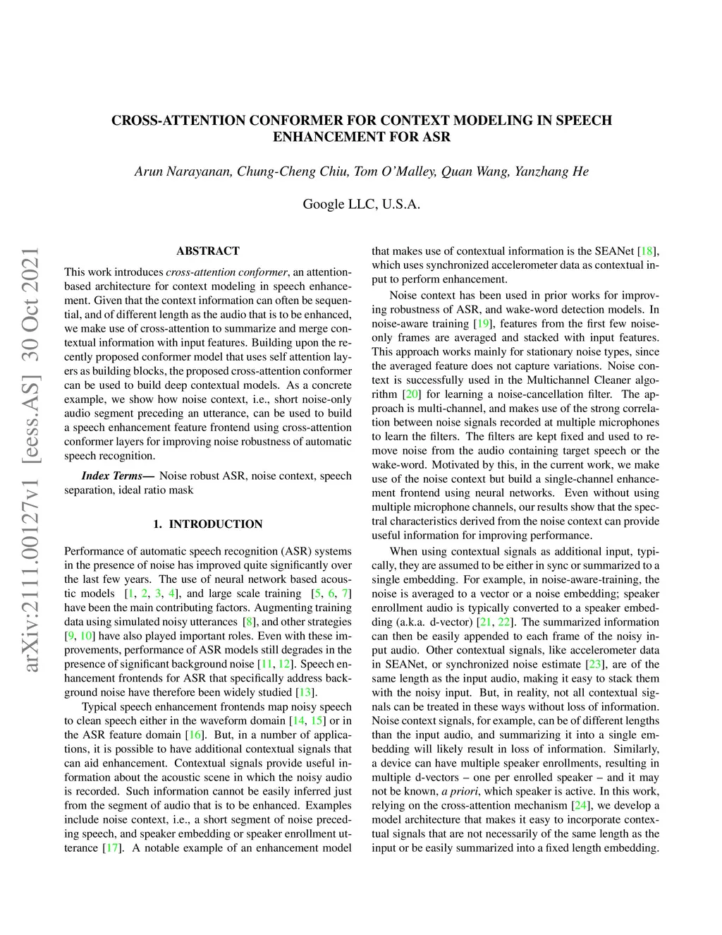 Cross-attention conformer for context modeling in speech enhancement for