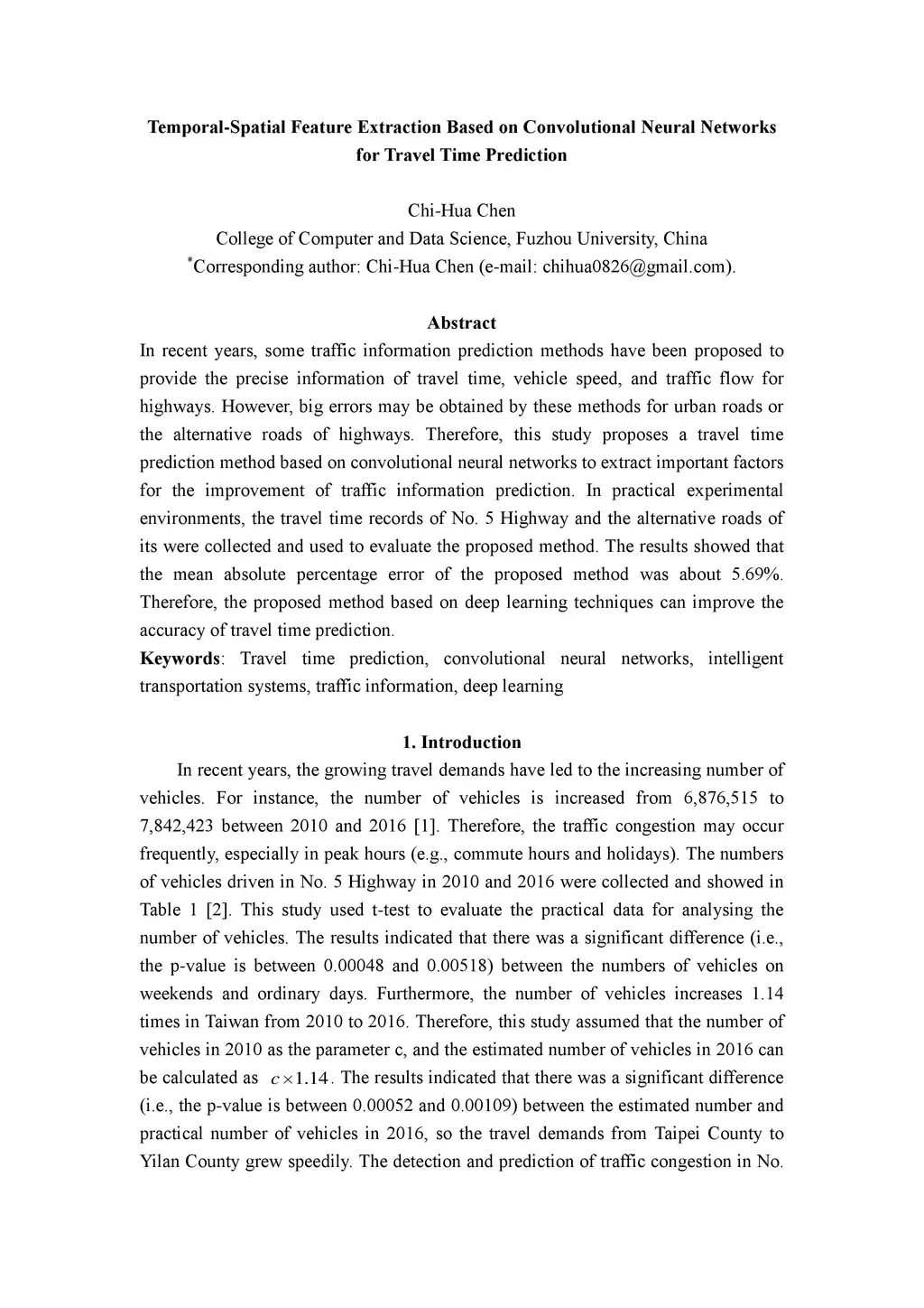In recent years, some traffic information prediction methods have been proposed to provide the precise information of travel time, vehicle speed, and traffic flow for highways. However, big errors may be obtained by these methods for urban roads or the alternative roads of highways. Therefore, this study proposes a travel time prediction method based on convolutional neural networks to extract important factors for the improvement of traffic information prediction. In practical experimental environments, the travel time records of No. 5 Highway and the alternative roads of its were collected and used to evaluate the proposed method. The results showed that the mean absolute percentage error of the proposed method was about 5.69%. Therefore, the proposed method based on deep learning techniques can improve the accuracy of travel time prediction.