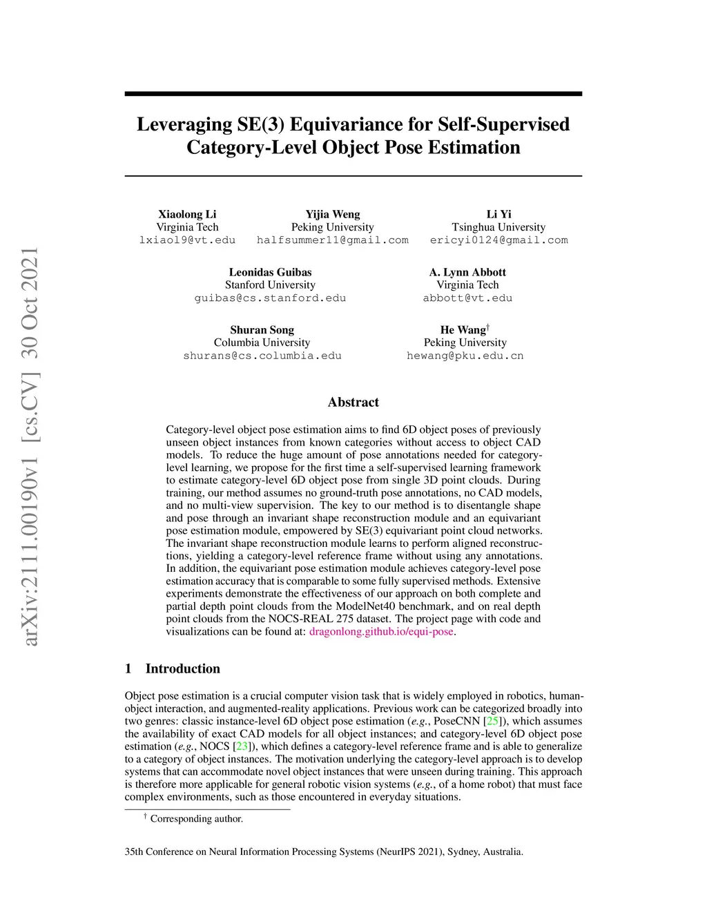 Leveraging SE(3) Equivariance for Self-Supervised Category-Level Object