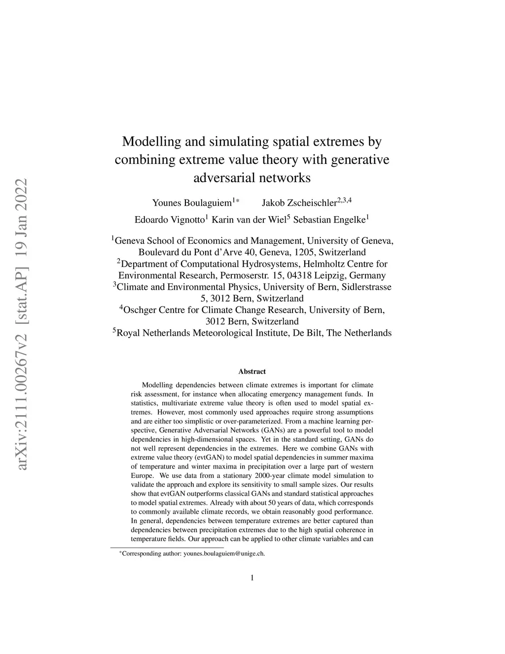 Modelling dependencies between climate extremes is important for climate risk assessment, for instance when allocating emergency management funds. In statistics, multivariate extreme value theory is often used to model spatial extremes. However, most commonly used approaches require strong assumptions and are either too simplistic or over-parameterized. From a machine learning perspective, Generative Adversarial Networks (GANs) are a powerful tool to model dependencies in high-dimensional spaces. Yet in the standard setting, GANs do not well represent dependencies in the extremes. Here we combine GANs with extreme value theory (evtGAN) to model spatial dependencies in summer maxima of temperature and winter maxima in precipitation over a large part of western Europe. We use data from a stationary 2000-year climate model simulation to validate the approach and explore its sensitivity to small sample sizes. Our results show that evtGAN outperforms classical GANs and standard statistical approaches to model spatial extremes. Already with about 50 years of data, which corresponds to commonly available climate records, we obtain reasonably good performance. In general, dependencies between temperature extremes are better captured than dependencies between precipitation extremes due to the high spatial coherence in temperature fields. Our approach can be applied to other climate variables and can be used to emulate climate models when running very long simulations to determine dependencies in the extremes is deemed infeasible.