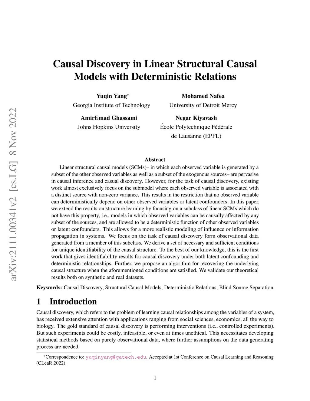 Linear structural causal models (SCMs) -- in which each observed variable is generated by a subset of the other observed variables as well as a subset of the exogenous sources -- are pervasive in causal inference and casual discovery. However, for the task of causal discovery, existing work almost exclusively focus on the submodel where each observed variable is associated with a distinct source with non-zero variance. This results in the restriction that no observed variable can deterministically depend on other observed variables or latent confounders. In this paper, we extend the results on structure learning by focusing on a subclass of linear SCMs which do not have this property, i.e., models in which observed variables can be causally affected by any subset of the sources, and are allowed to be a deterministic function of other observed variables or latent confounders. This allows for a more realistic modeling of influence or information propagation in systems. We focus on the task of causal discovery form observational data generated from a member of this subclass. We derive a set of necessary and sufficient conditions for unique identifiability of the causal structure. To the best of our knowledge, this is the first work that gives identifiability results for causal discovery under both latent confounding and deterministic relationships. Further, we propose an algorithm for recovering the underlying causal structure when the aforementioned conditions are satisfied. We validate our theoretical results both on synthetic and real datasets.