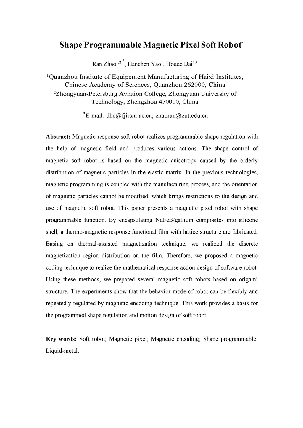 Magnetic response soft robot realizes programmable shape regulation with the help of magnetic field and produces various actions. The shape control of magnetic soft robot is based on the magnetic anisotropy caused by the orderly distribution of magnetic particles in the elastic matrix. In the previous technologies, magnetic programming is coupled with the manufacturing process, and the orientation of magnetic particles cannot be modified, which brings restrictions to the design and use of magnetic soft robot. This paper presents a magnetic pixel robot with shape programmable function. By encapsulating NdFeB/gallium composites into silicone shell, a thermo-magnetic response functional film with lattice structure are fabricated. Basing on thermal-assisted magnetization technique, we realized the discrete magnetization region distribution on the film. Therefore, we proposed a magnetic coding technique to realize the mathematical response action design of software robot. Using these methods, we prepared several magnetic soft robots based on origami structure. The experiments show that the behavior mode of robot can be flexibly and repeatedly regulated by magnetic encoding technique. This work provides a basis for the programmed shape regulation and motion design of soft robot.