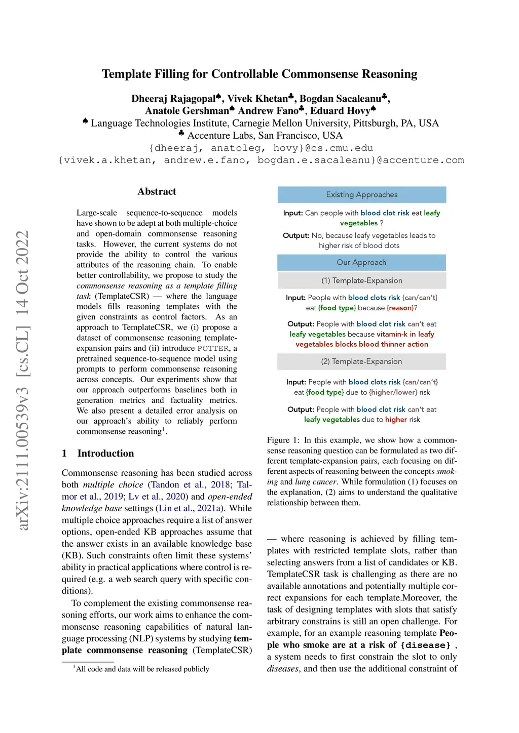 Large-scale sequence-to-sequence models have shown to be adept at both multiple-choice and open-domain commonsense reasoning tasks. However, the current systems do not provide the ability to control the various attributes of the reasoning chain. To enable better controllability, we propose to study the commonsense reasoning as a template filling task (TemplateCSR) -- where the language models fills reasoning templates with the given constraints as control factors. As an approach to TemplateCSR, we (i) propose a dataset of commonsense reasoning template-expansion pairs and (ii) introduce POTTER, a pretrained sequence-to-sequence model using prompts to perform commonsense reasoning across concepts. Our experiments show that our approach outperforms baselines both in generation metrics and factuality metrics. We also present a detailed error analysis on our approach's ability to reliably perform commonsense reasoning.