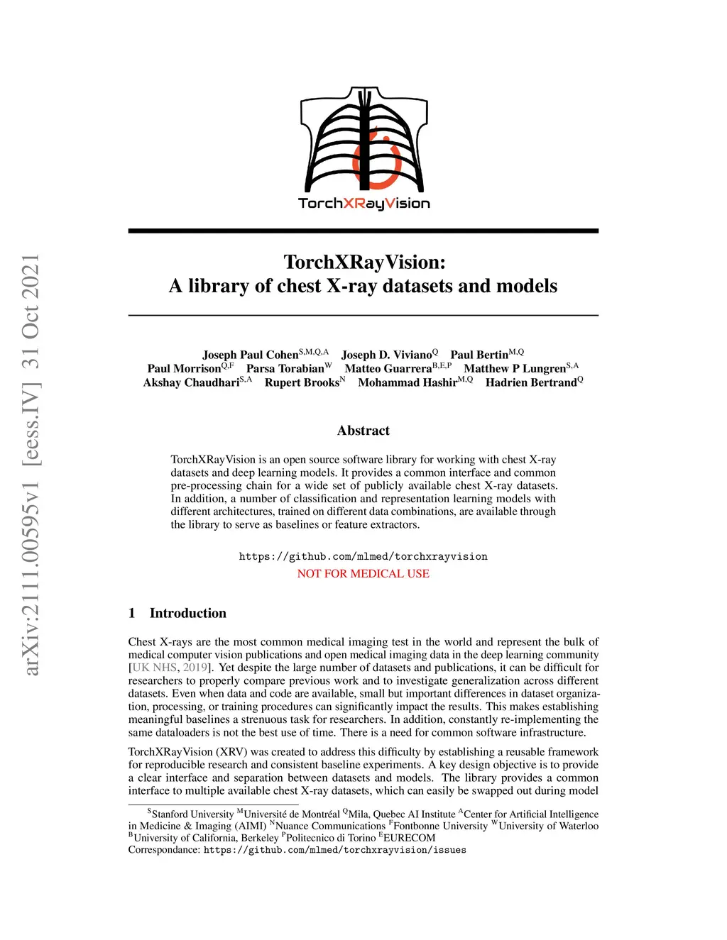 TorchXRayVision is an open source software library for working with chest X-ray datasets and deep learning models. It provides a common interface and common pre-processing chain for a wide set of publicly available chest X-ray datasets. In addition, a number of classification and representation learning models with different architectures, trained on different data combinations, are available through the library to serve as baselines or feature extractors.
