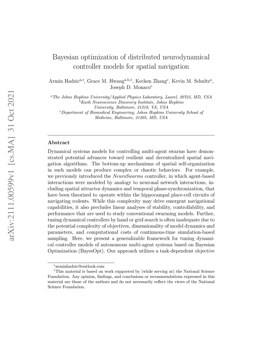 Dynamical systems models for controlling multi-agent swarms have demonstrated advances toward resilient, decentralized navigation algorithms. We previously introduced the NeuroSwarms controller, in which agent-based interactions were modeled by analogy to neuronal network interactions, including attractor dynamics and phase synchrony, that have been theorized to operate within hippocampal place-cell circuits in navigating rodents. This complexity precludes linear analyses of stability, controllability, and performance typically used to study conventional swarm models. Further, tuning dynamical controllers by hand or grid search is often inadequate due to the complexity of objectives, dimensionality of model parameters, and computational costs of simulation-based sampling. Here, we present a framework for tuning dynamical controller models of autonomous multi-agent systems based on Bayesian Optimization (BayesOpt). Our approach utilizes a task-dependent objective function to train Gaussian Processes (GPs) as surrogate models to achieve adaptive and efficient exploration of a dynamical controller model's parameter space. We demonstrate this approach by studying an objective function selecting for NeuroSwarms behaviors that cooperatively localize and capture spatially distributed rewards under time pressure. We generalized task performance across environments by combining scores for simulations in distinct geometries. To validate search performance, we compared high-dimensional clustering for high- vs. low-likelihood parameter points by visualizing sample trajectories in Uniform Manifold Approximation and Projection (UMAP) embeddings. Our findings show that adaptive, sample-efficient evaluation of the self-organizing behavioral capacities of complex systems, including dynamical swarm controllers, can accelerate the translation of neuroscientific theory to applied domains.