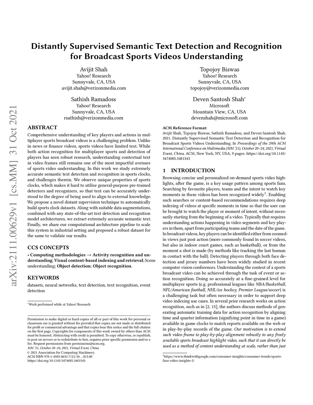 Comprehensive understanding of key players and actions in multiplayer sports broadcast videos is a challenging problem. Unlike in news or finance videos, sports videos have limited text. While both action recognition for multiplayer sports and detection of players has seen robust research, understanding contextual text in video frames still remains one of the most impactful avenues of sports video understanding. In this work we study extremely accurate semantic text detection and recognition in sports clocks, and challenges therein. We observe unique properties of sports clocks, which makes it hard to utilize general-purpose pre-trained detectors and recognizers, so that text can be accurately understood to the degree of being used to align to external knowledge. We propose a novel distant supervision technique to automatically build sports clock datasets. Along with suitable data augmentations, combined with any state-of-the-art text detection and recognition model architectures, we extract extremely accurate semantic text. Finally, we share our computational architecture pipeline to scale this system in industrial setting and proposed a robust dataset for the same to validate our results.