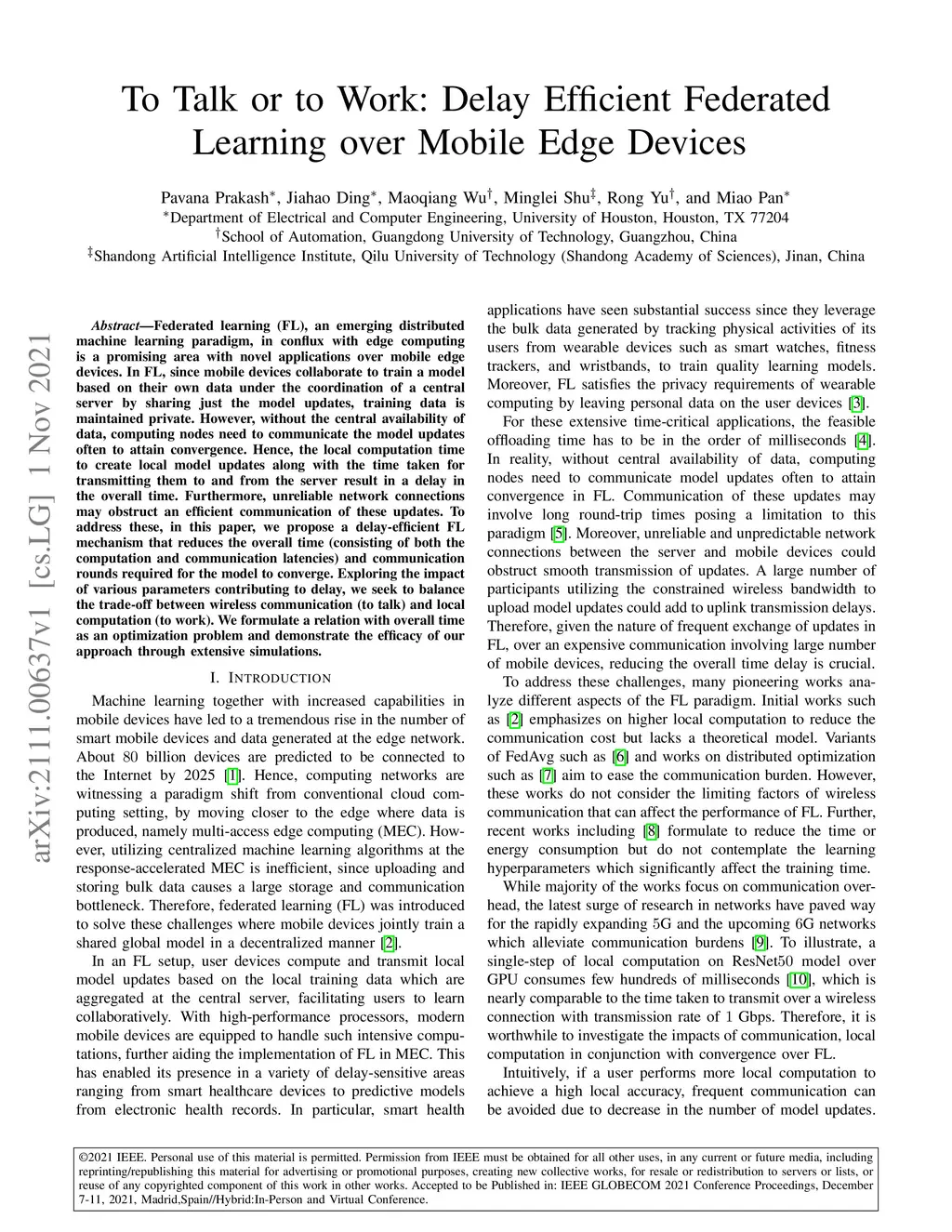Federated learning (FL), an emerging distributed machine learning paradigm, in conflux with edge computing is a promising area with novel applications over mobile edge devices. In FL, since mobile devices collaborate to train a model based on their own data under the coordination of a central server by sharing just the model updates, training data is maintained private. However, without the central availability of data, computing nodes need to communicate the model updates often to attain convergence. Hence, the local computation time to create local model updates along with the time taken for transmitting them to and from the server result in a delay in the overall time. Furthermore, unreliable network connections may obstruct an efficient communication of these updates. To address these, in this paper, we propose a delay-efficient FL mechanism that reduces the overall time (consisting of both the computation and communication latencies) and communication rounds required for the model to converge. Exploring the impact of various parameters contributing to delay, we seek to balance the trade-off between wireless communication (to talk) and local computation (to work). We formulate a relation with overall time as an optimization problem and demonstrate the efficacy of our approach through extensive simulations.