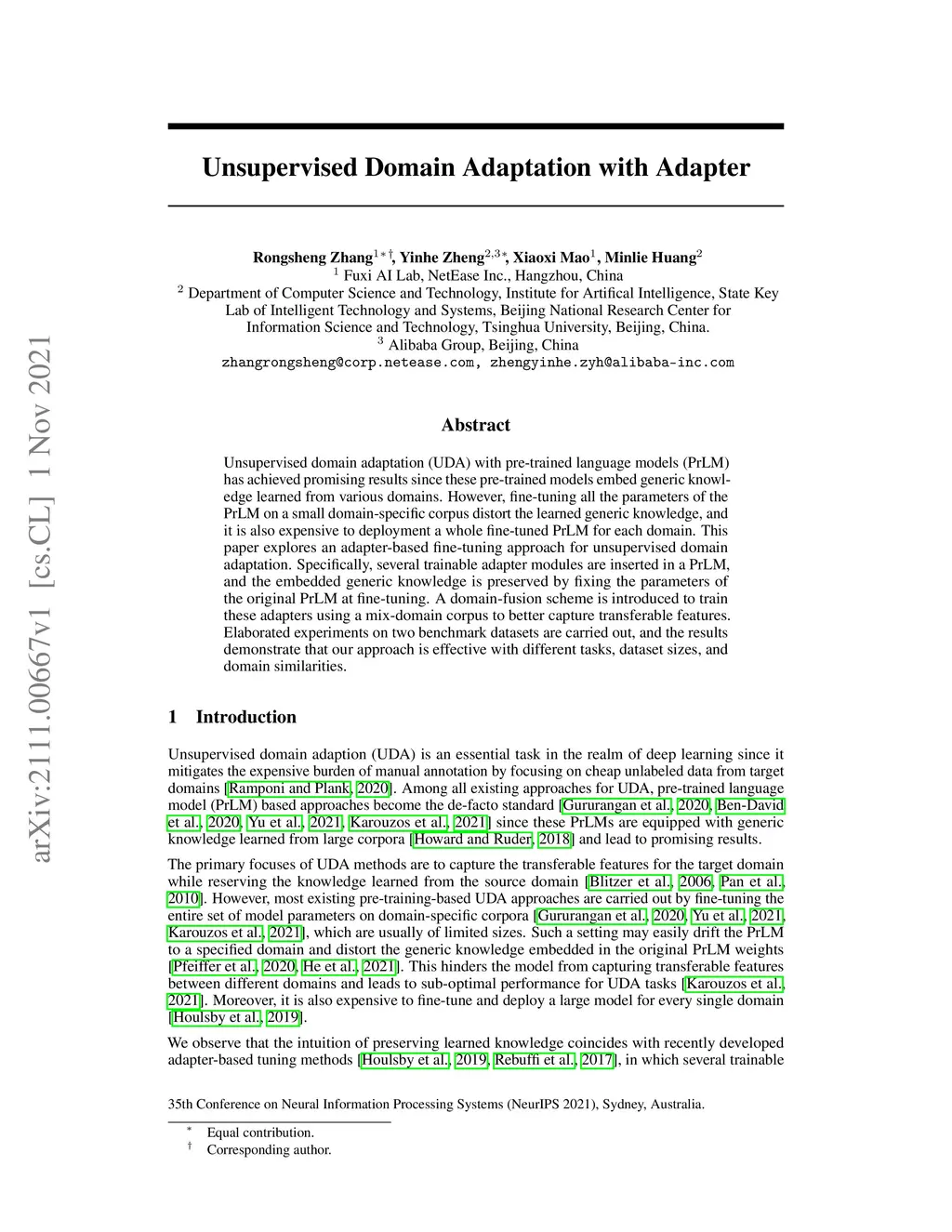 Unsupervised domain adaptation (UDA) with pre-trained language models (PrLM) has achieved promising results since these pre-trained models embed generic knowledge learned from various domains. However, fine-tuning all the parameters of the PrLM on a small domain-specific corpus distort the learned generic knowledge, and it is also expensive to deployment a whole fine-tuned PrLM for each domain. This paper explores an adapter-based fine-tuning approach for unsupervised domain adaptation. Specifically, several trainable adapter modules are inserted in a PrLM, and the embedded generic knowledge is preserved by fixing the parameters of the original PrLM at fine-tuning. A domain-fusion scheme is introduced to train these adapters using a mix-domain corpus to better capture transferable features. Elaborated experiments on two benchmark datasets are carried out, and the results demonstrate that our approach is effective with different tasks, dataset sizes, and domain similarities.