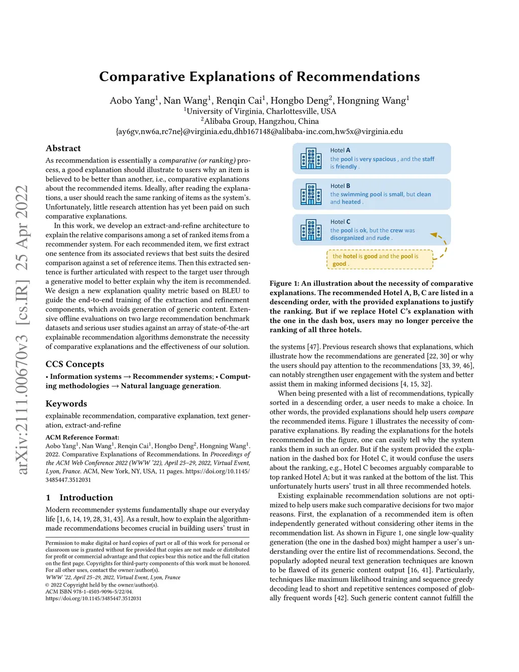 As recommendation is essentially a comparative (or ranking) process, a good explanation should illustrate to users why an item is believed to be better than another, i.e., comparative explanations about the recommended items. Ideally, after reading the explanations, a user should reach the same ranking of items as the system's. Unfortunately, little research attention has yet been paid on such comparative explanations. In this work, we develop an extract-and-refine architecture to explain the relative comparisons among a set of ranked items from a recommender system. For each recommended item, we first extract one sentence from its associated reviews that best suits the desired comparison against a set of reference items. Then this extracted sentence is further articulated with respect to the target user through a generative model to better explain why the item is recommended. We design a new explanation quality metric based on BLEU to guide the end-to-end training of the extraction and refinement components, which avoids generation of generic content. Extensive offline evaluations on two large recommendation benchmark datasets and serious user studies against an array of state-of-the-art explainable recommendation algorithms demonstrate the necessity of comparative explanations and the effectiveness of our solution.