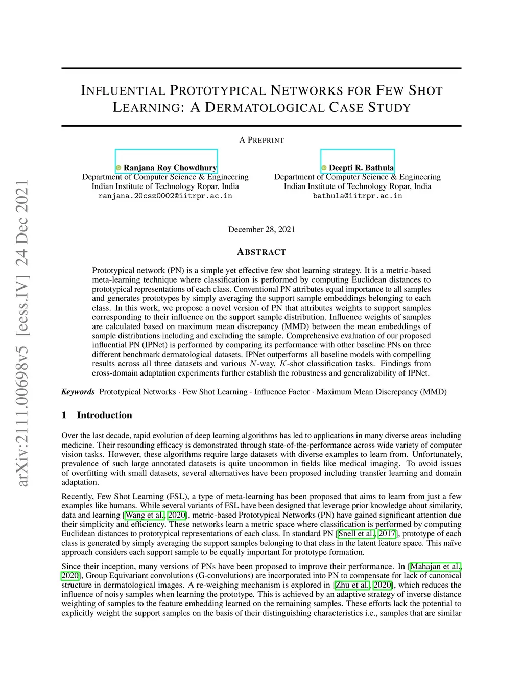 Prototypical network (PN) is a simple yet effective few shot learning strategy. It is a metric-based meta-learning technique where classification is performed by computing Euclidean distances to prototypical representations of each class. Conventional PN attributes equal importance to all samples and generates prototypes by simply averaging the support sample embeddings belonging to each class. In this work, we propose a novel version of PN that attributes weights to support samples corresponding to their influence on the support sample distribution. Influence weights of samples are calculated based on maximum mean discrepancy (MMD) between the mean embeddings of sample distributions including and excluding the sample. Comprehensive evaluation of our proposed influential PN (IPNet) is performed by comparing its performance with other baseline PNs on three different benchmark dermatological datasets. IPNet outperforms all baseline models with compelling results across all three datasets and various N-way, K-shot classification tasks. Findings from cross-domain adaptation experiments further establish the robustness and generalizability of IPNet.