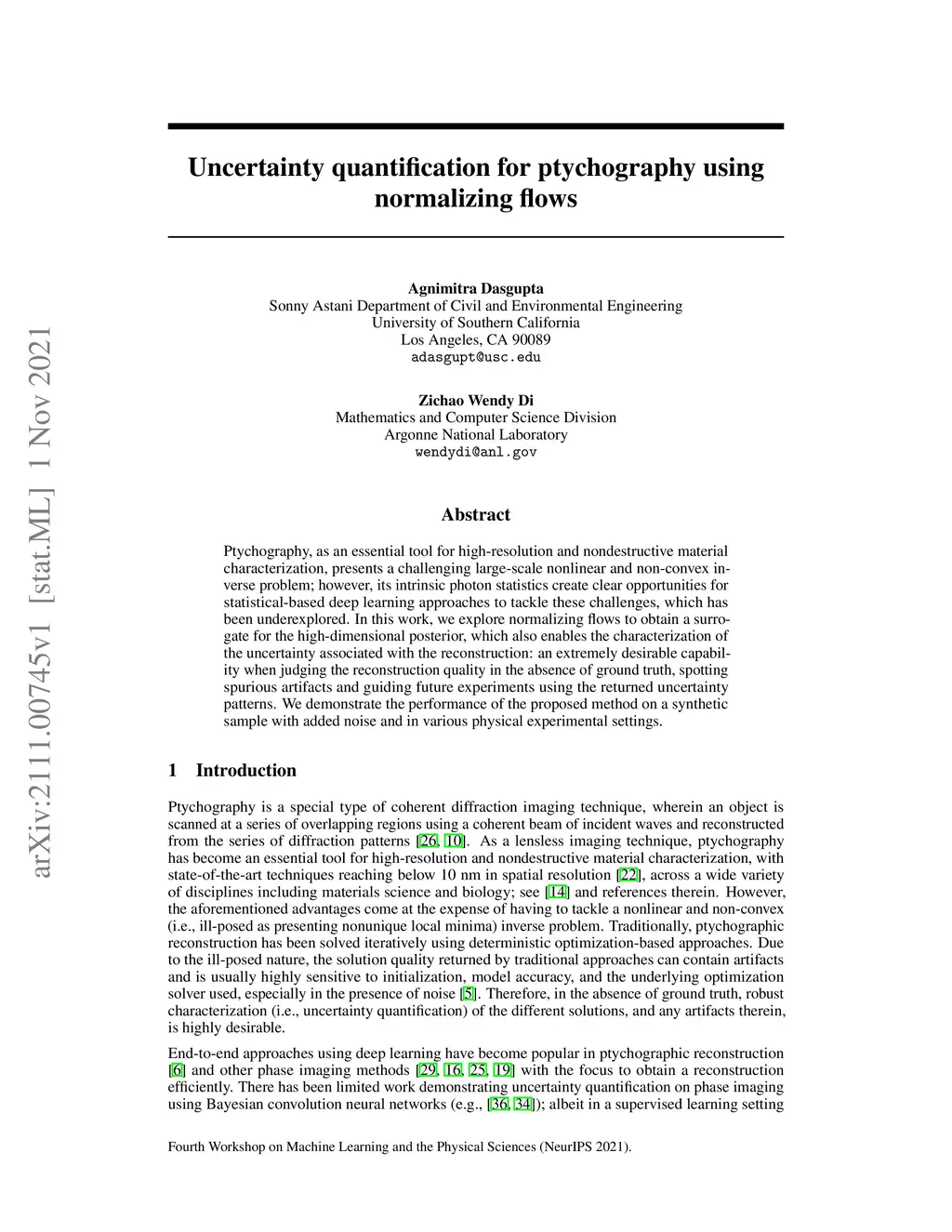 Ptychography, as an essential tool for high-resolution and nondestructive material characterization, presents a challenging large-scale nonlinear and non-convex inverse problem; however, its intrinsic photon statistics create clear opportunities for statistical-based deep learning approaches to tackle these challenges, which has been underexplored. In this work, we explore normalizing flows to obtain a surrogate for the high-dimensional posterior, which also enables the characterization of the uncertainty associated with the reconstruction: an extremely desirable capability when judging the reconstruction quality in the absence of ground truth, spotting spurious artifacts and guiding future experiments using the returned uncertainty patterns. We demonstrate the performance of the proposed method on a synthetic sample with added noise and in various physical experimental settings.