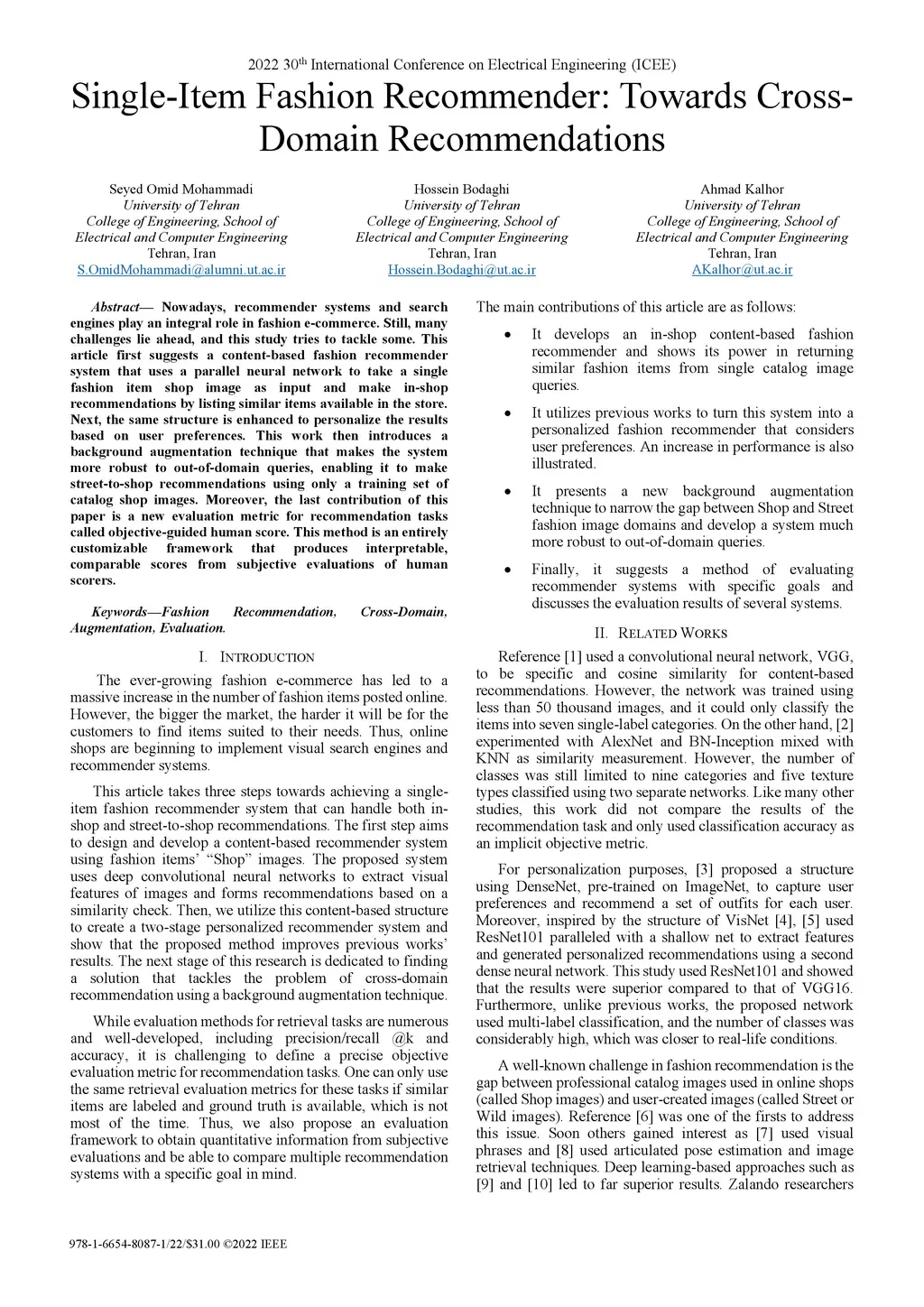 Nowadays, recommender systems and search engines play an integral role in fashion e-commerce. Still, many challenges lie ahead, and this study tries to tackle some. This article first suggests a content-based fashion recommender system that uses a parallel neural network to take a single fashion item shop image as input and make in-shop recommendations by listing similar items available in the store. Next, the same structure is enhanced to personalize the results based on user preferences. This work then introduces a background augmentation technique that makes the system more robust to out-of-domain queries, enabling it to make street-to-shop recommendations using only a training set of catalog shop images. Moreover, the last contribution of this paper is a new evaluation metric for recommendation tasks called objective-guided human score. This method is an entirely customizable framework that produces interpretable, comparable scores from subjective evaluations of human scorers.