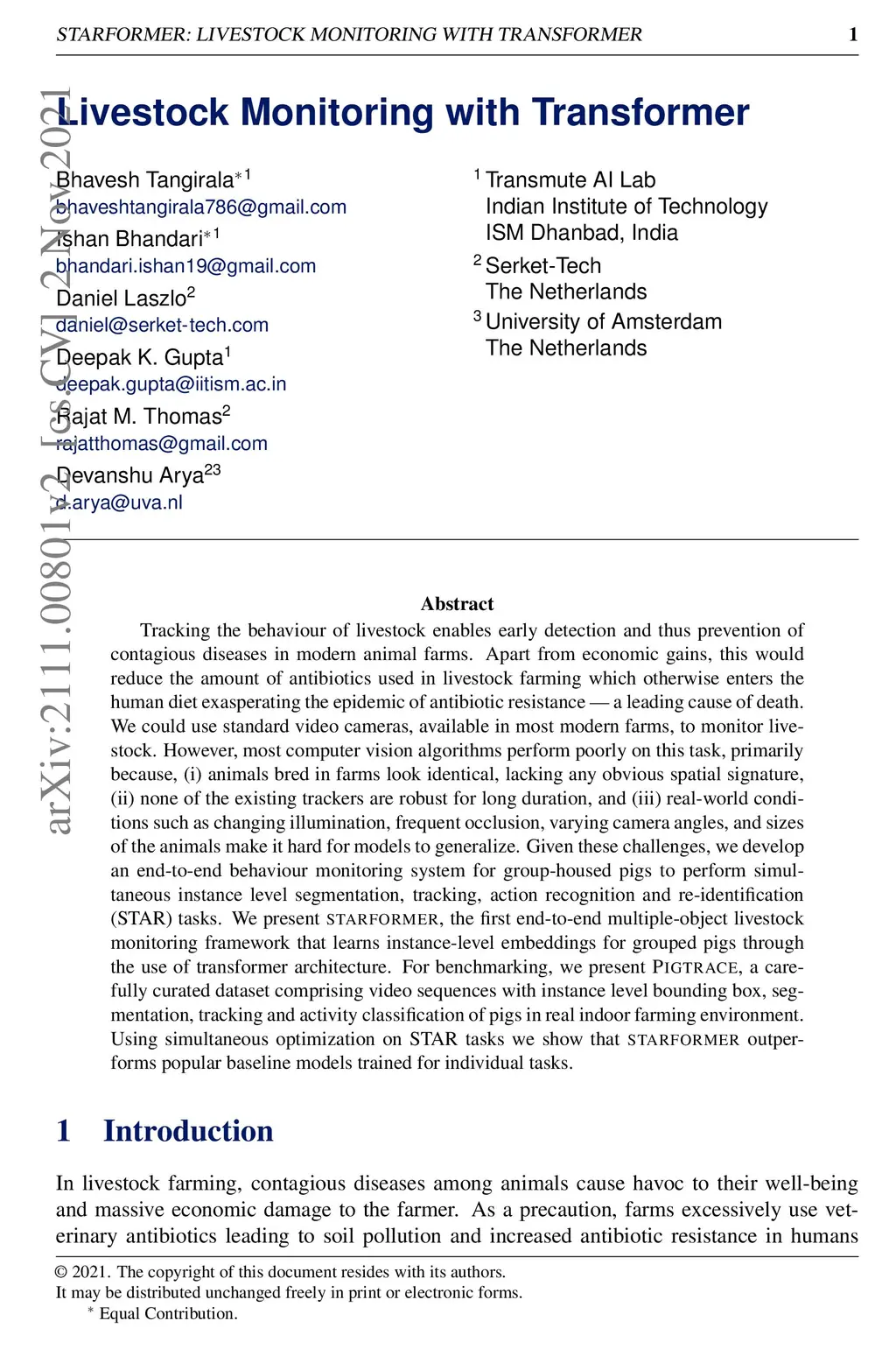 Tracking the behaviour of livestock enables early detection and thus prevention of contagious diseases in modern animal farms. Apart from economic gains, this would reduce the amount of antibiotics used in livestock farming which otherwise enters the human diet exasperating the epidemic of antibiotic resistance - a leading cause of death. We could use standard video cameras, available in most modern farms, to monitor livestock. However, most computer vision algorithms perform poorly on this task, primarily because, (i) animals bred in farms look identical, lacking any obvious spatial signature, (ii) none of the existing trackers are robust for long duration, and (iii) real-world conditions such as changing illumination, frequent occlusion, varying camera angles, and sizes of the animals make it hard for models to generalize. Given these challenges, we develop an end-to-end behaviour monitoring system for group-housed pigs to perform simultaneous instance level segmentation, tracking, action recognition and re-identification (STAR) tasks. We present starformer, the first end-to-end multiple-object livestock monitoring framework that learns instance-level embeddings for grouped pigs through the use of transformer architecture. For benchmarking, we present Pigtrace, a carefully curated dataset comprising video sequences with instance level bounding box, segmentation, tracking and activity classification of pigs in real indoor farming environment. Using simultaneous optimization on STAR tasks we show that starformer outperforms popular baseline models trained for individual tasks.