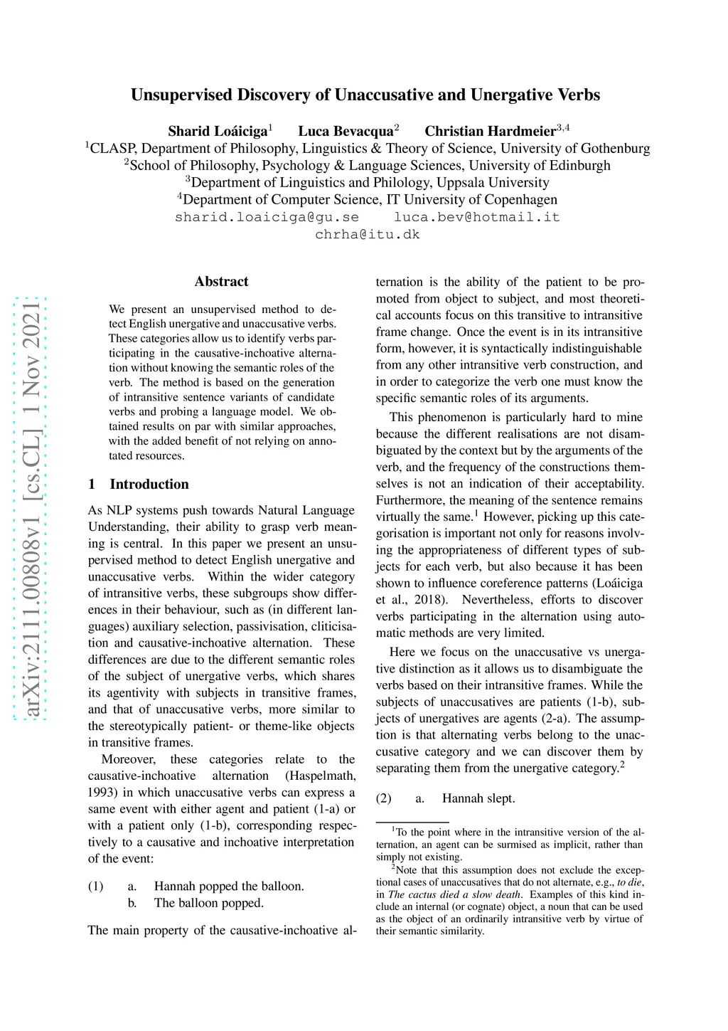 Unsupervised Discovery of Unaccusative and Unergative Verbs