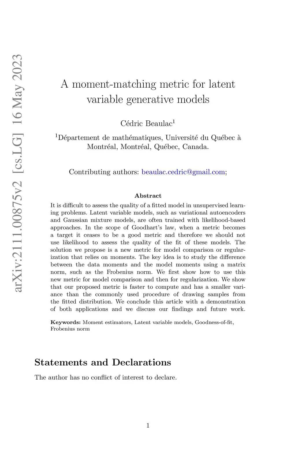 It can be difficult to assess the quality of a fitted model when facing unsupervised learning problems. Latent variable models, such as variation autoencoders and Gaussian mixture models, are often trained with likelihood-based approaches. In scope of Goodhart's law, when a metric becomes a target it ceases to be a good metric and therefore we should not use likelihood to assess the quality of the fit of these models. The solution we propose is a new metric for model comparison or regularization that relies on moments. The concept is to study the difference between the data moments and the model moments using a matrix norm, such as the Frobenius norm. We show how to use this new metric for model comparison and then for regularization. It is common to draw samples from the fitted distribution when evaluating latent variable models and we show that our proposed metric is faster to compute and has a smaller variance that this alternative. We conclude this article with a proof of concept of both applications and we discuss future work.