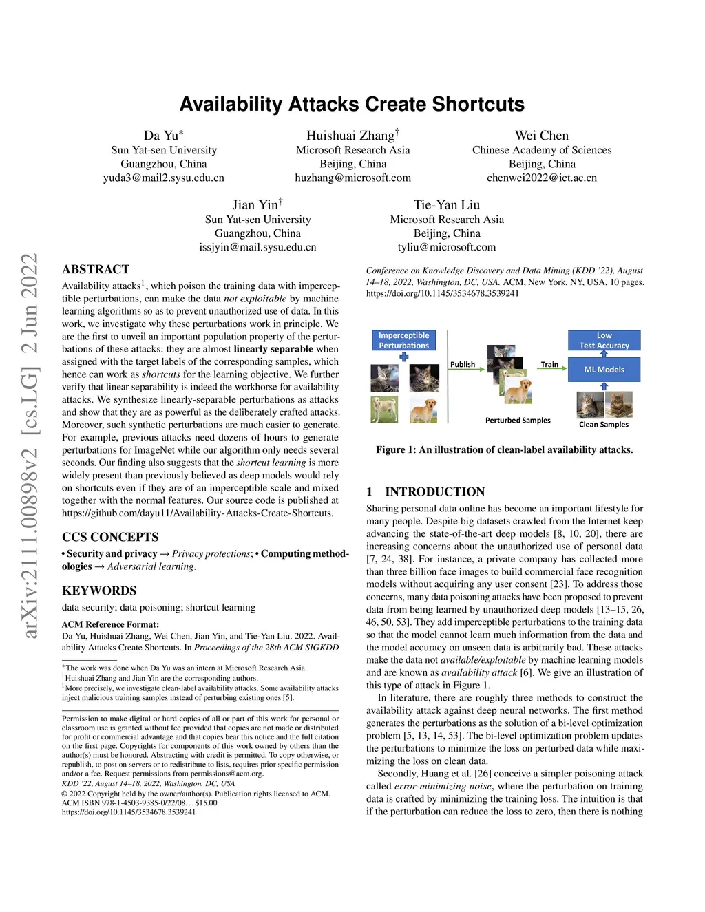 Availability attacks, which poison the training data with imperceptible perturbations, can make the data \emph{not exploitable} by machine learning algorithms so as to prevent unauthorized use of data. In this work, we investigate why these perturbations work in principle. We are the first to unveil an important population property of the perturbations of these attacks: they are almost \textbf{linearly separable} when assigned with the target labels of the corresponding samples, which hence can work as \emph{shortcuts} for the learning objective. We further verify that linear separability is indeed the workhorse for availability attacks. We synthesize linearly-separable perturbations as attacks and show that they are as powerful as the deliberately crafted attacks. Moreover, such synthetic perturbations are much easier to generate. For example, previous attacks need dozens of hours to generate perturbations for ImageNet while our algorithm only needs several seconds. Our finding also suggests that the \emph{shortcut learning} is more widely present than previously believed as deep models would rely on shortcuts even if they are of an imperceptible scale and mixed together with the normal features. Our source code is published at \url{https://github.com/dayu11/Availability-Attacks-Create-Shortcuts}.