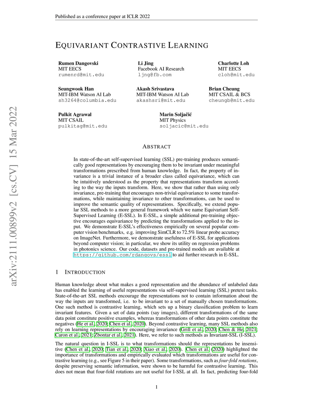 In state-of-the-art self-supervised learning (SSL) pre-training produces semantically good representations by encouraging them to be invariant under meaningful transformations prescribed from human knowledge. In fact, the property of invariance is a trivial instance of a broader class called equivariance, which can be intuitively understood as the property that representations transform according to the way the inputs transform. Here, we show that rather than using only invariance, pre-training that encourages non-trivial equivariance to some transformations, while maintaining invariance to other transformations, can be used to improve the semantic quality of representations. Specifically, we extend popular SSL methods to a more general framework which we name Equivariant Self-Supervised Learning (E-SSL). In E-SSL, a simple additional pre-training objective encourages equivariance by predicting the transformations applied to the input. We demonstrate E-SSL's effectiveness empirically on several popular computer vision benchmarks, e.g. improving SimCLR to 72.5% linear probe accuracy on ImageNet. Furthermore, we demonstrate usefulness of E-SSL for applications beyond computer vision; in particular, we show its utility on regression problems in photonics science. Our code, datasets and pre-trained models are available at https://github.com/rdangovs/essl to aid further research in E-SSL.