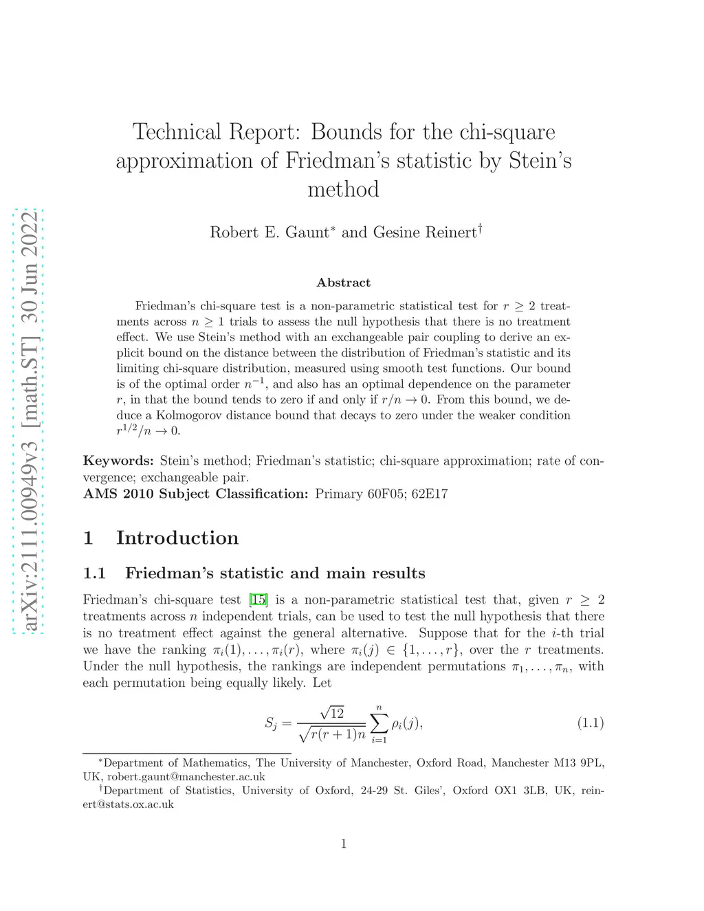 Friedman's chi-square test is a non-parametric statistical test for treatments across trials to assess the null hypothesis that there is no treatment effect. We use Stein's method with an exchangeable pair coupling to derive an explicit bound on the distance between the distribution of Friedman's statistic and its limiting chi-square distribution, measured using smooth test functions. Our bound is of the optimal order , and also has an optimal dependence on the parameter , in that the bound tends to zero if and only if . From this bound, we deduce a Kolmogorov distance bound that decays to zero under the weaker condition .