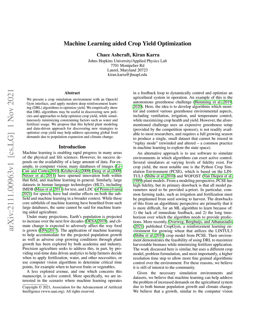 We present a crop simulation environment with an OpenAI Gym interface, and apply modern deep reinforcement learning (DRL) algorithms to optimize yield. We empirically show that DRL algorithms may be useful in discovering new policies and approaches to help optimize crop yield, while simultaneously minimizing constraining factors such as water and fertilizer usage. We propose that this hybrid plant modeling and data-driven approach for discovering new strategies to optimize crop yield may help address upcoming global food demands due to population expansion and climate change.