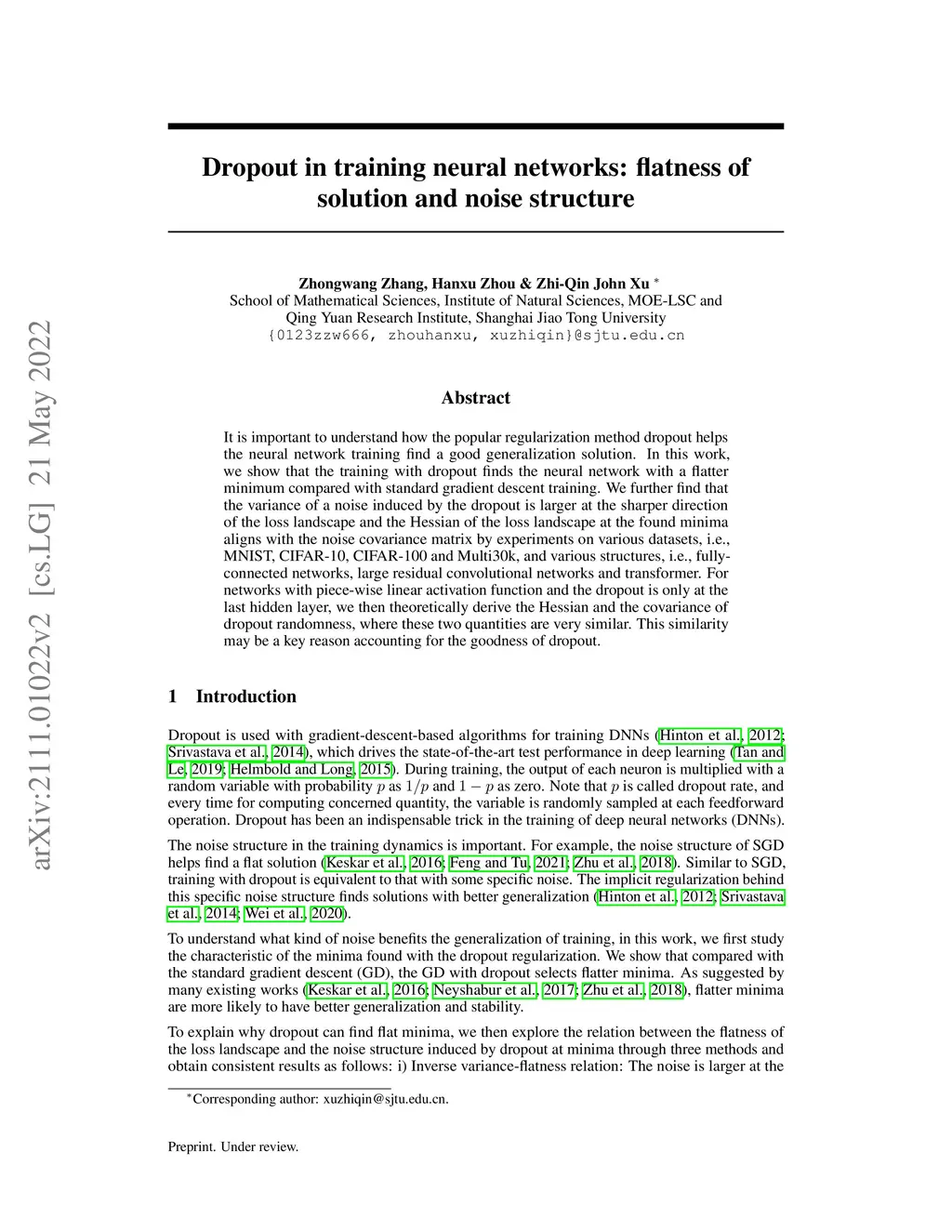 It is important to understand how the popular regularization method dropout helps the neural network training find a good generalization solution. In this work, we show that the training with dropout finds the neural network with a flatter minimum compared with standard gradient descent training. We further find that the variance of a noise induced by the dropout is larger at the sharper direction of the loss landscape and the Hessian of the loss landscape at the found minima aligns with the noise covariance matrix by experiments on various datasets, i.e., MNIST, CIFAR-10, CIFAR-100 and Multi30k, and various structures, i.e., fully-connected networks, large residual convolutional networks and transformer. For networks with piece-wise linear activation function and the dropout is only at the last hidden layer, we then theoretically derive the Hessian and the covariance of dropout randomness, where these two quantities are very similar. This similarity may be a key reason accounting for the goodness of dropout.