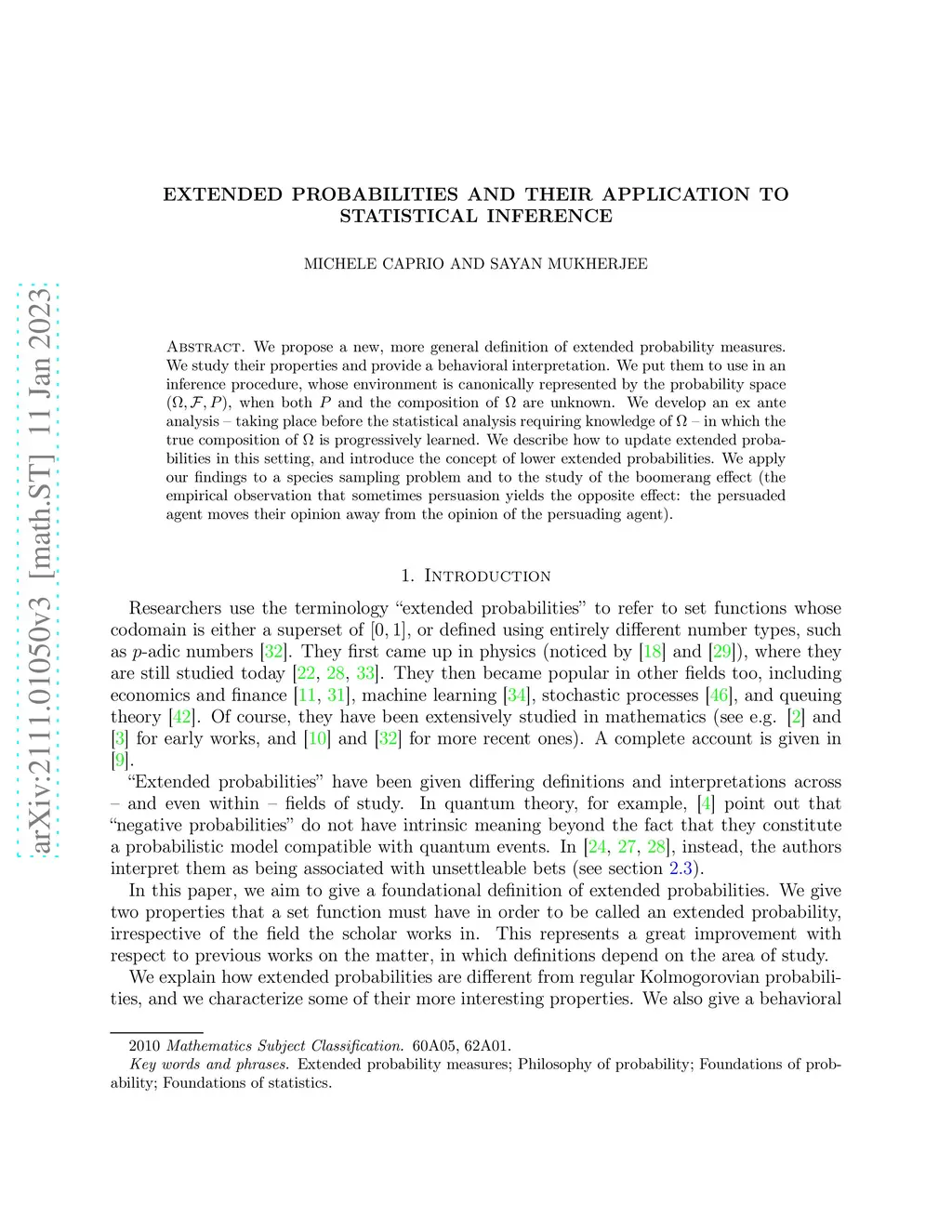 We propose a new, more general definition of extended probability measures. We study their properties and provide a behavioral interpretation. We put them to use in an inference procedure, whose environment is canonically represented by the probability space , when both and the composition of are unknown. We develop an ex ante analysis -- taking place before the statistical analysis requiring knowledge of -- in which the true composition of is progressively learned. We describe how to update extended probabilities in this setting, and introduce the concept of lower extended probabilities. We apply our findings to a species sampling problem and to the study of the boomerang effect (the empirical observation that sometimes persuasion yields the opposite effect: the persuaded agent moves their opinion away from the opinion of the persuading agent).
