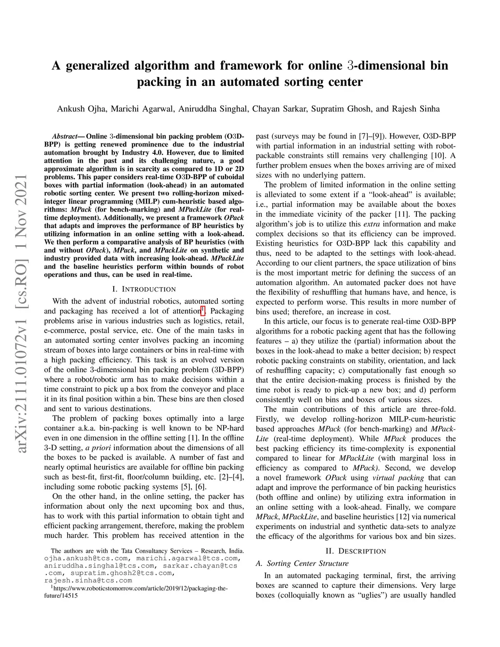 Online 3-dimensional bin packing problem (O3D-BPP) is getting renewed prominence due to the industrial automation brought by Industry 4.0. However, due to limited attention in the past and its challenging nature, a good approximate algorithm is in scarcity as compared to 1D or 2D problems. This paper considers real-time OD-BPP of cuboidal boxes with partial information (look-ahead) in an automated robotic sorting center. We present two rolling-horizon mixed-integer linear programming (MILP) cum-heuristic based algorithms: MPack (for bench-marking) and MPackLite (for real-time deployment). Additionally, we present a framework OPack that adapts and improves the performance of BP heuristics by utilizing information in an online setting with a look-ahead. We then perform a comparative analysis of BP heuristics (with and without OPack), MPack, and MPackLite on synthetic and industry provided data with increasing look-ahead. MPackLite and the baseline heuristics perform within bounds of robot operations and thus, can be used in real-time.